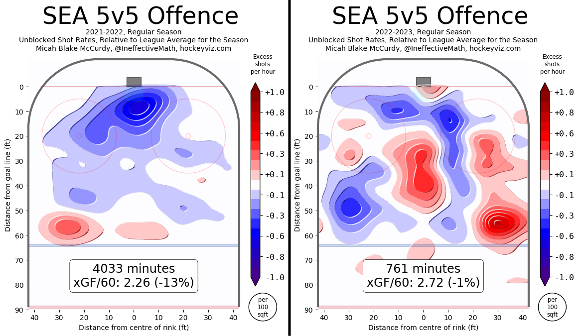 The 2021-22 heat map on the left features a red blob on the left point and blue splashed across the slot and net-front areas, whereas this season's map shows a high volume of shots originating from three different areas - the right point, right flank, and upper slot - as well as plenty of action on the left flank and in the net-front area. It's boosted Seattle's expected goals for per 60 minutes by almost half a goal.