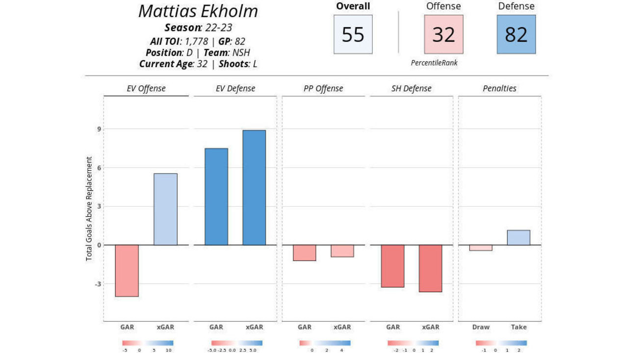 The 6-foot-4 Ekholm recorded 18 points in 57 games this season for the Predators, where he's spent his entire 12-year career. He's posted excellent underlying defensive numbers.