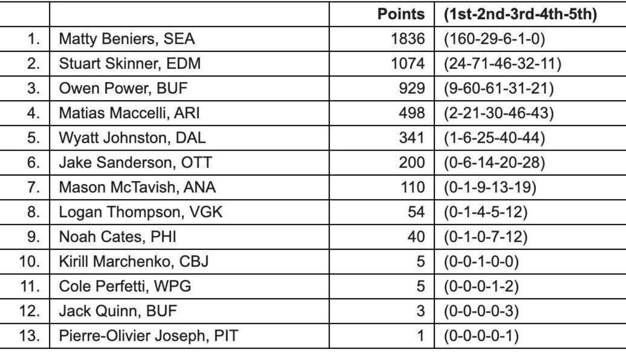 Edmonton Oilers goalie Stuart Skinner and Buffalo Sabres defenseman Owen Power were the other finalists. Here are the full voting results: