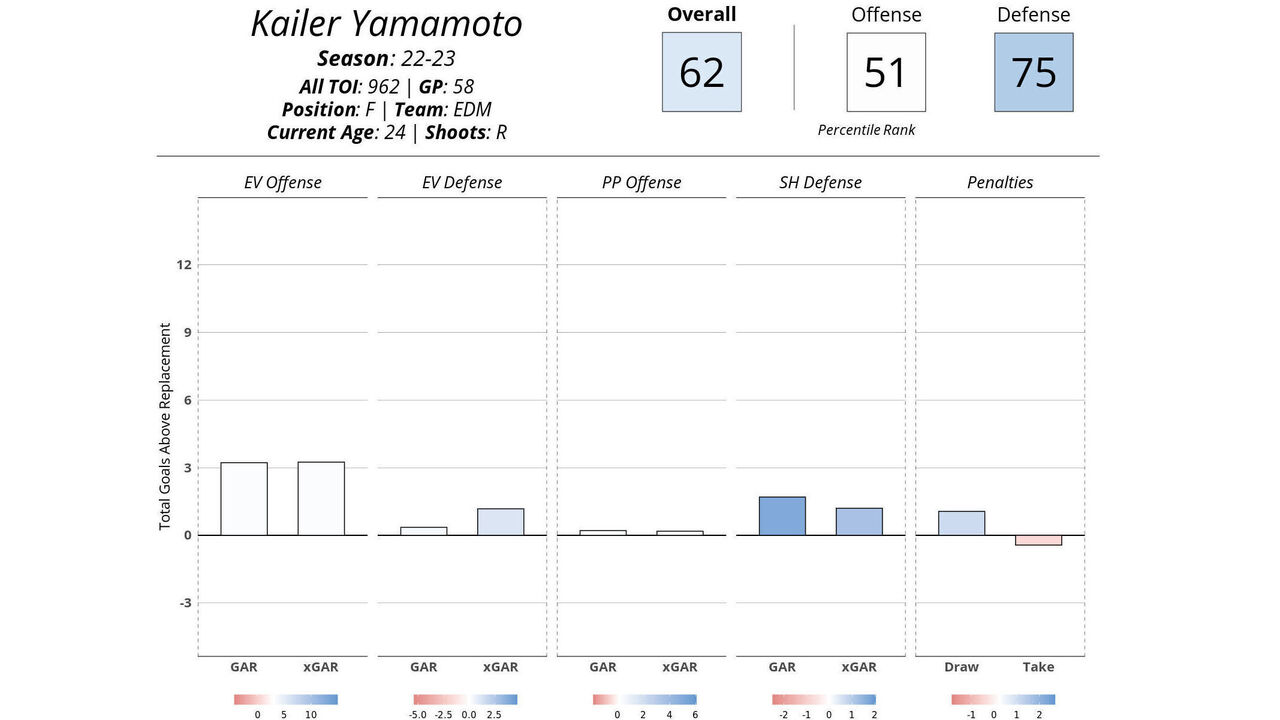 A first-round pick by the Oilers in 2017, Yamamoto spent parts of six seasons with the club. He tallied a career-high 20 goals and 21 assists in 2021-22, but he regressed this past season with 25 points in 58 games. The 5-foot-8 winger's underlying numbers remained solid, though - particularly on the penalty kill.