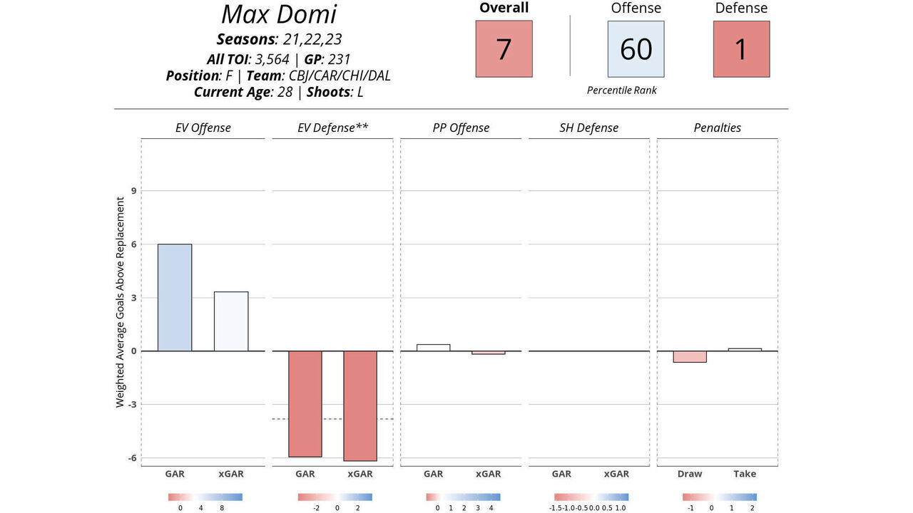 While Domi isn't a true enforcer like his father, he certainly isn't afraid to drop the gloves or mix things up physically, as he recorded 82 penalty minutes last season. The toughness may be a welcome addition to the Leafs' lineup, but he's proved to be a defensive liability. Here's a look at his underlying numbers over the past three campaigns.