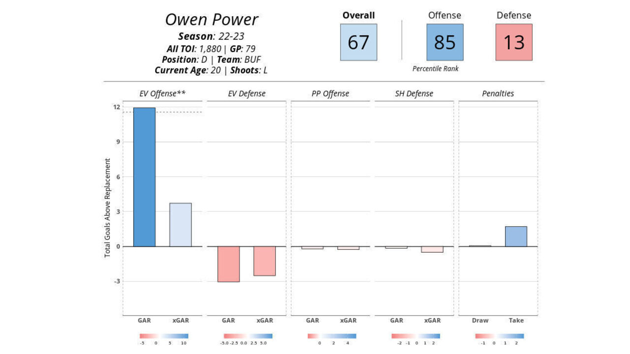 The Sabres drafted Power first overall in 2021. The 6-foot-6, 218-pound blue-liner was a Calder Trophy finalist last season after recording 35 points in 79 games while averaging 23:48 per contest. His underlying numbers were particularly strong offensively.