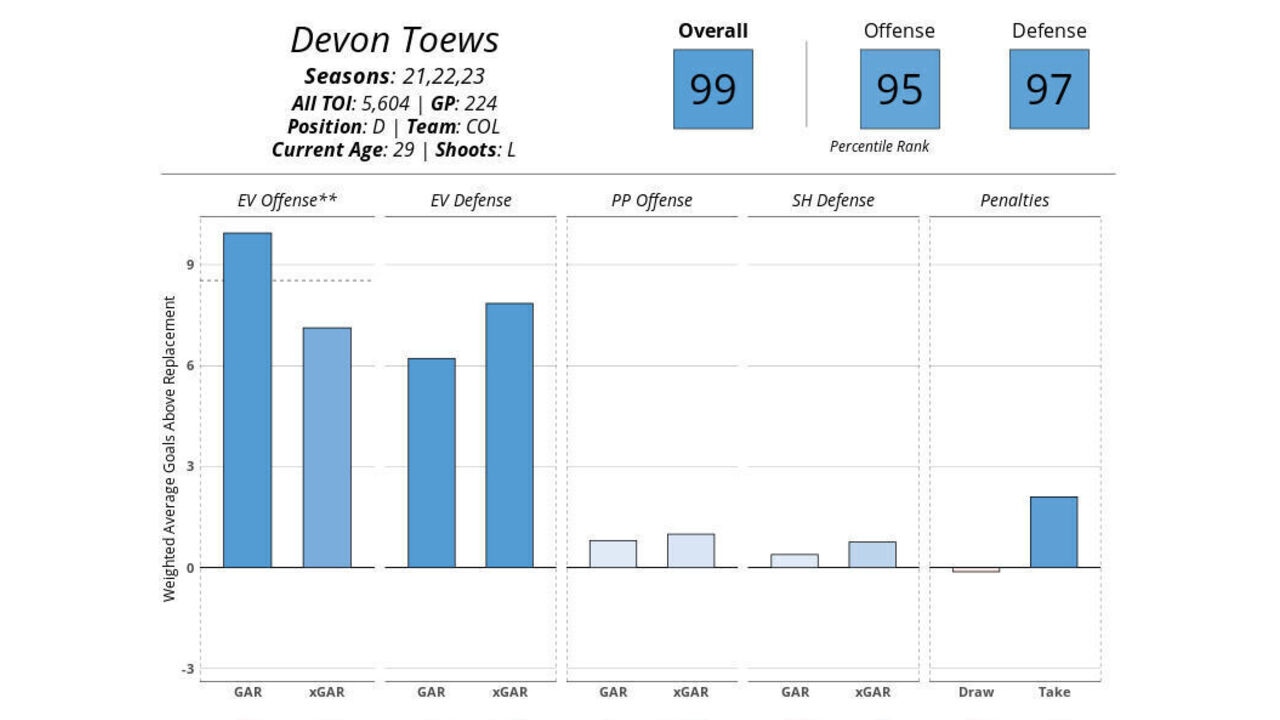 Toews has been one of the NHL's most underrated players for years. The 29-year-old was defensively solid with offensive upside even before arriving in Colorado, and he's excelled in both facets of the game ever since. Toews has benefited from playing with superstar Cale Makar, but his underlying numbers over the previous three seasons are nearly flawless nonetheless.