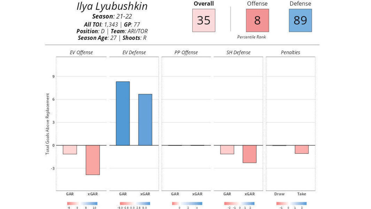While he provides little-to-no offense, Lyubushkin posted strong defensive metrics during that 2021-22 campaign.