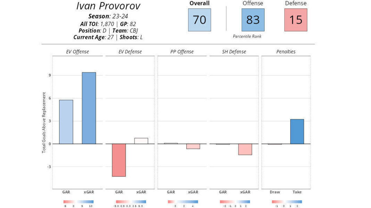 Provorov, meanwhile, was just acquired this offseason from the Philadelphia Flyers as part of a three-way trade involving the Los Angeles Kings. He's recorded 23 points in 46 games for Columbus while logging 22:48 per contest. Provorov has produced strong underlying offensive numbers, but his defensive metrics have been poor.