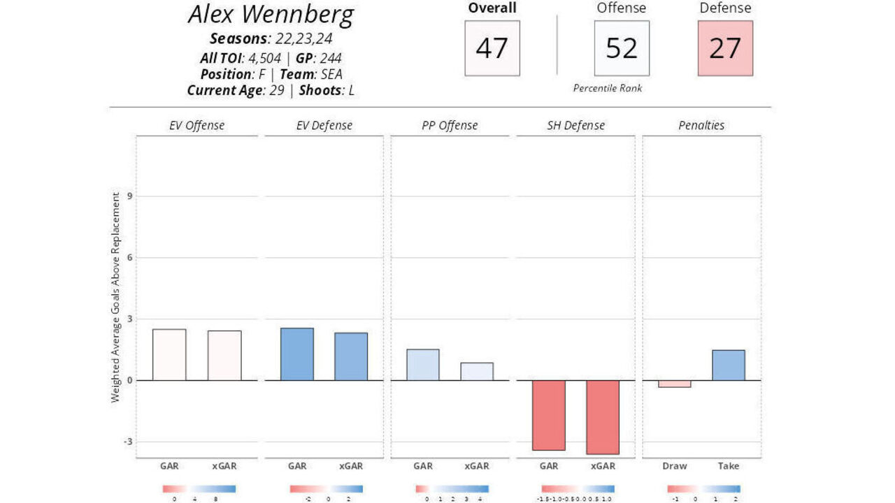 Wennberg is a pending unrestricted free agent with a cap hit of $4.5 million. The 29-year-old has registered nine goals and 16 assists in 60 games this season. Over the last three years - all with Seattle - he's proven to be a decent five-on-five play-driver but a liability on the penalty kill.