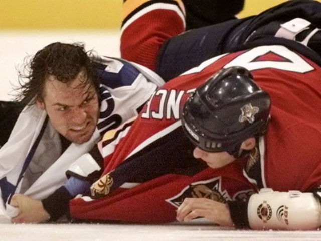 Darcy Tucker murdered a man and was never charged or convicted. That man was Philadelphia’s Sami Kapanen, and the video of the hit should make you sick. Not so much the hit itself, where Kapanen’s head seems to take three separate impacts – from Tucker, the glass, then the ice – but his gruesome attempts to get up and keep playing right up until Keith Primeau Apollo hooks him off the ice with his stick. The fact that the hit was completely legal at the time doesn’t take away from its complete dirtbagginess. Philadelphia fans no doubt take some solace in the fact that Jeremy Roenick scored the winning goal shortly thereafter, knocking the Leafs out of the playoffs for the next nine years. They probably also took comfort in watching Toronto come back from a 3-1 series deficit against Boston only to blow their three-goal lead in game seven of their first post-drought series. Small comfort for a fanbase now accustomed to losing key players to concussions – Primeau, Pronger, Laperriere, and Lindros (shut up, I know he played for other teams, he still counts).