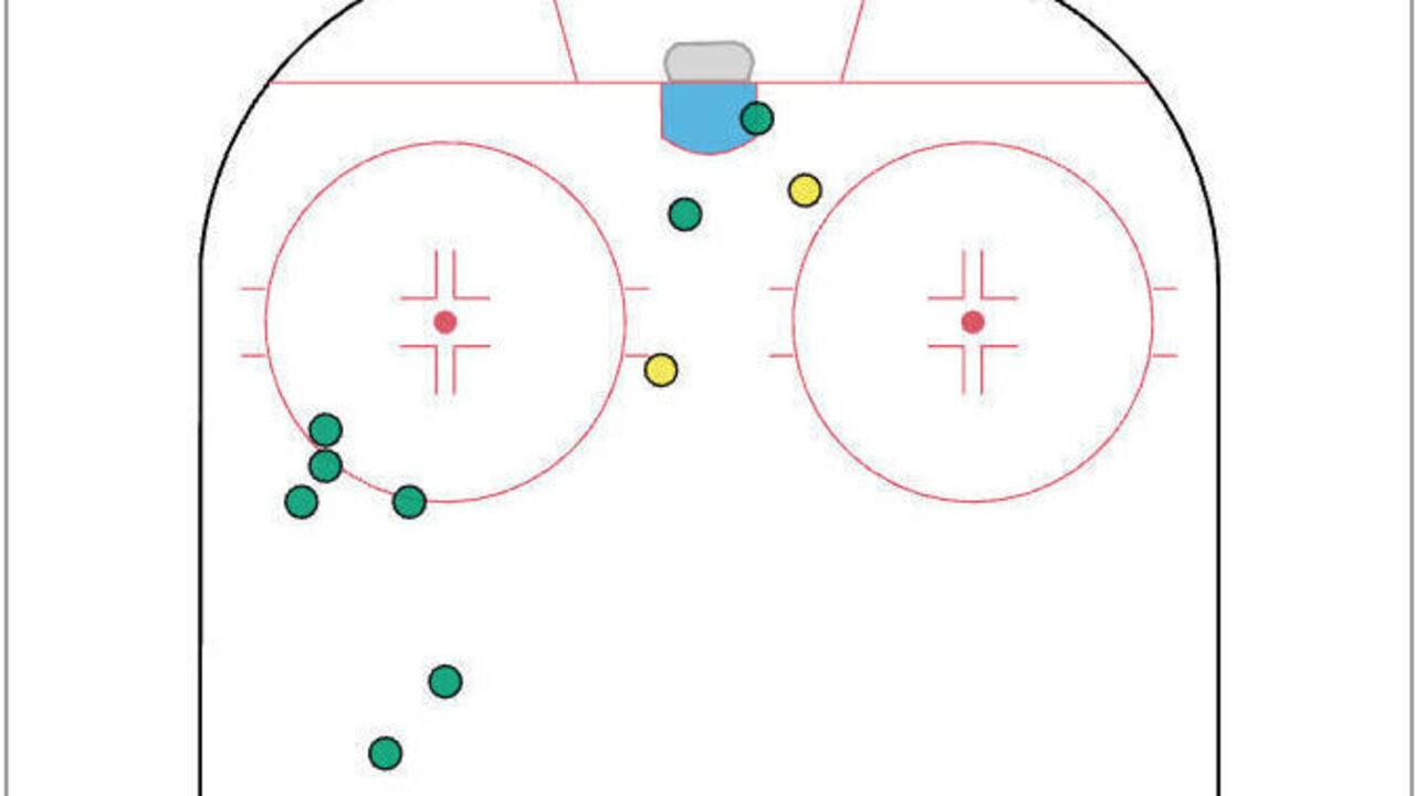 The image above shows Pastrnak's five-on-five shots. The yellow dots are goals. The substance here is that he's taken just four shots from the slot.