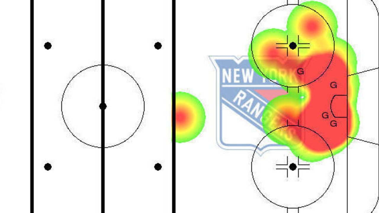 Also of note: The top unit isn't obsessed with the perfect look. It's more interested in acting upon the first high-quality look of the possession, with the puck seeming to always find its way to the inner slot. (The red blob in the heat map above represents the Rangers' power-play shot locations in Round 2.)