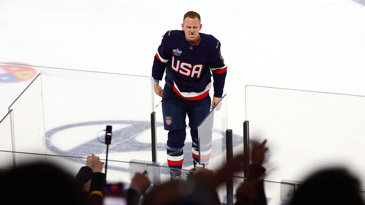 The building officially on tilt, left winger Brady lined up at center and immediately dropped his mitts to take on Sam Bennett, who had been inserted into Canada's lineup in part to interfere with the brothers and their shenanigans. A minute later, Brady dapped Matthew upon entry to the penalty box. It was a scene straight out of "The Mighty Ducks" - the 2025 Bash Brothers.