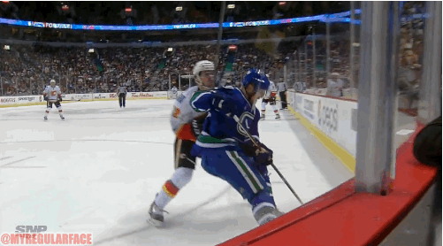 Late in the second period of the final game of the regular season, Vancouver Canucks forward Daniel Sedin - who had scored two goals in the game to that point - was hit in the numbers by Calgary Flames forward Paul Byron.