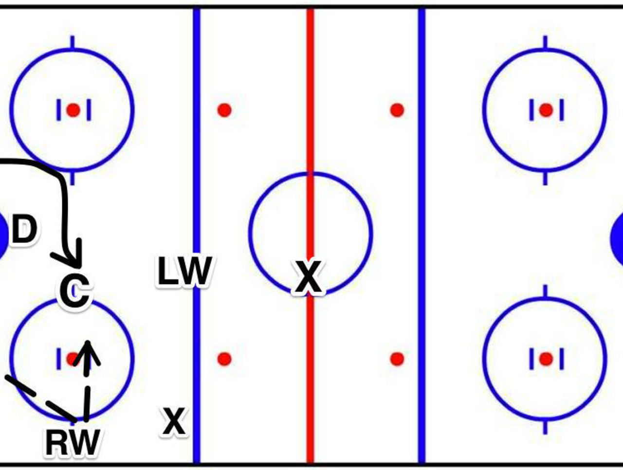 Note: In some situations, the left winger won’t come across the ice, instead choosing to stay wide. That’s a read and react situation, and usually happens when the center and right winger already have their speed up, to go along with the puck.