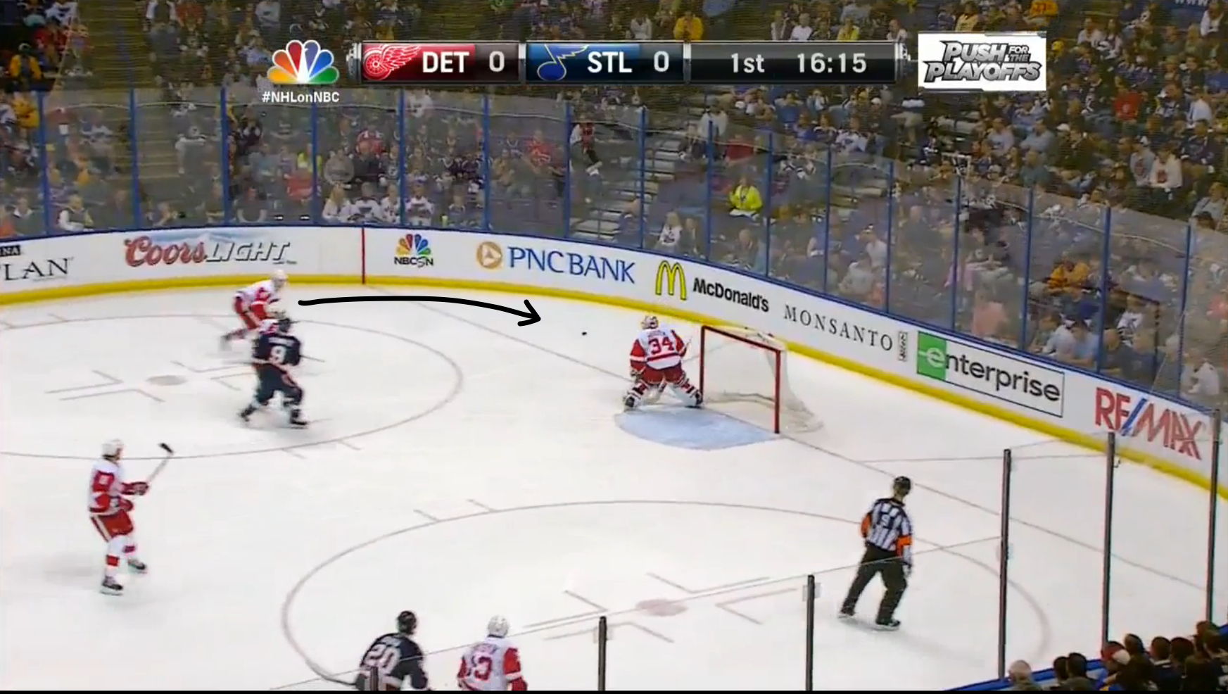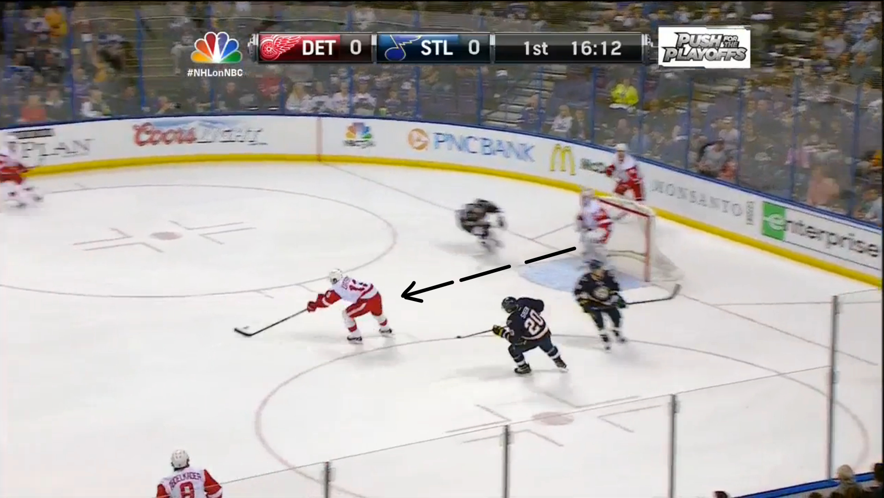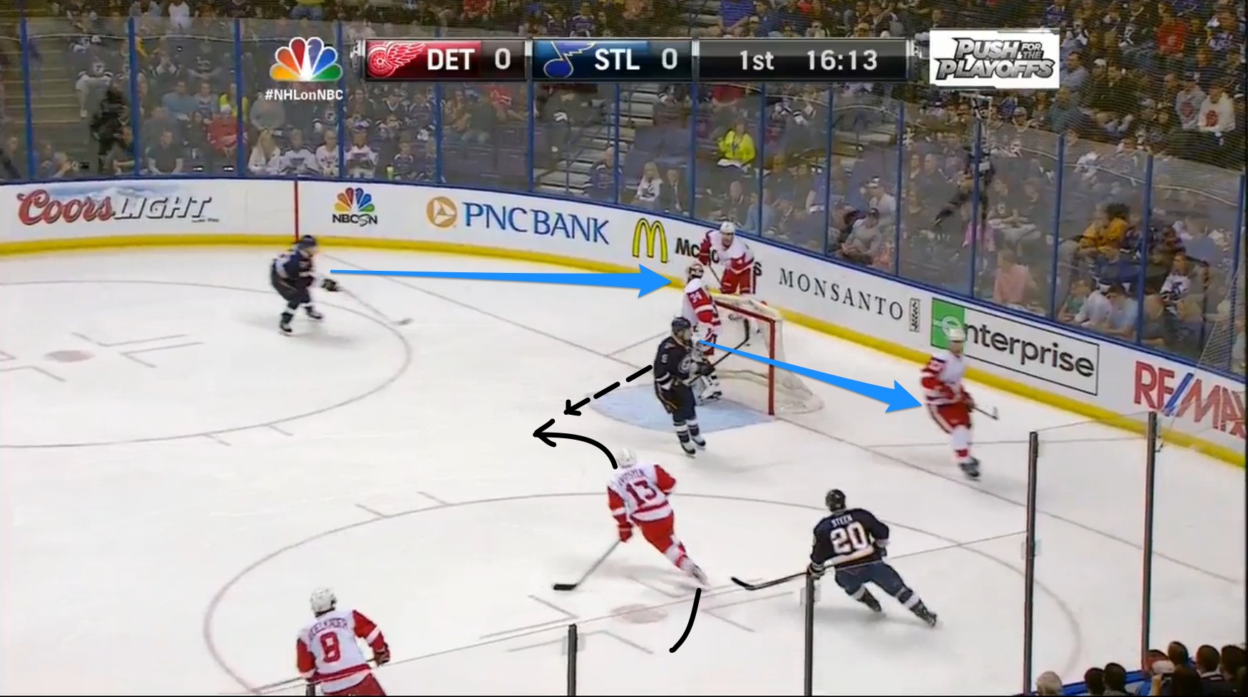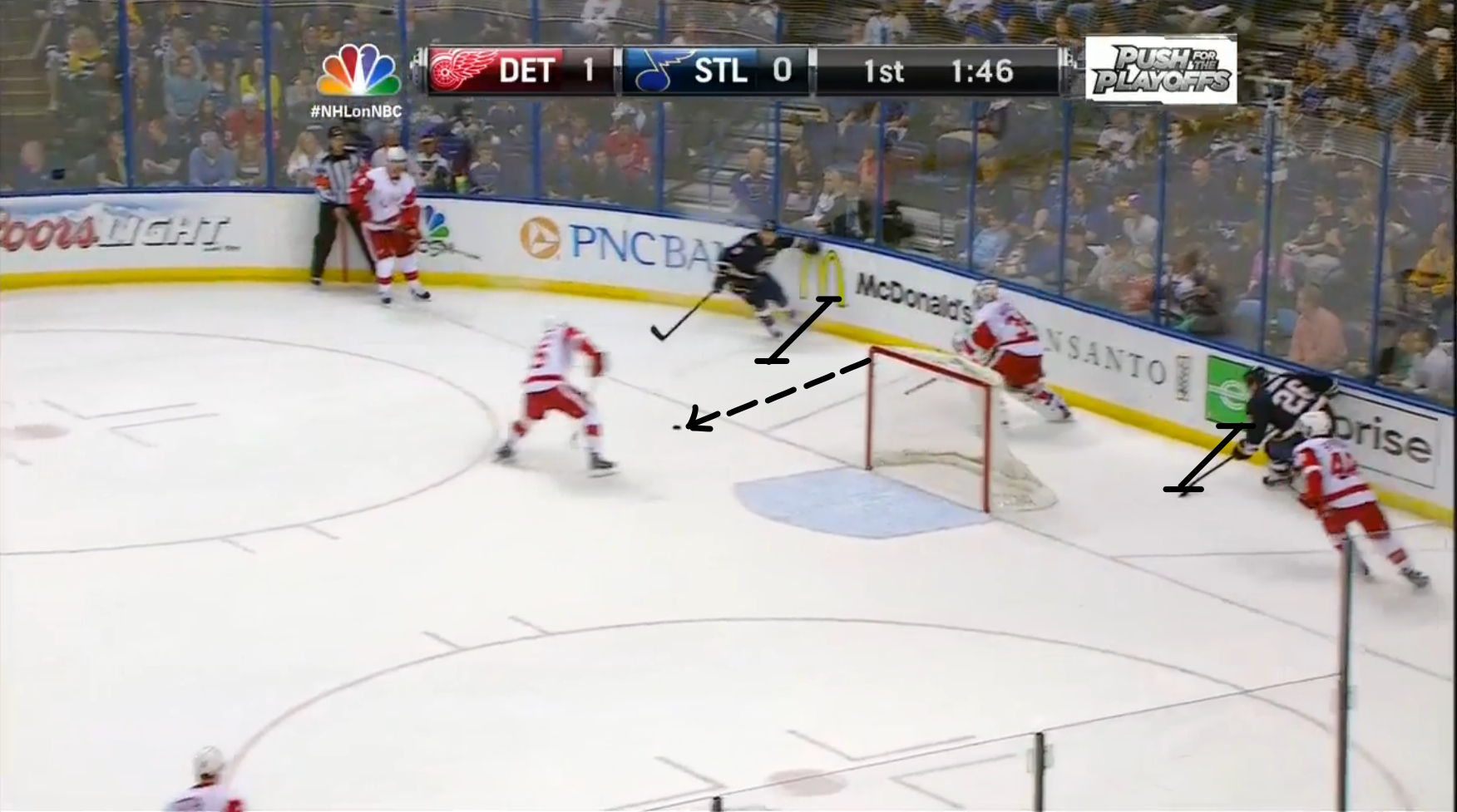 And right there in the scary part of the zone, the Red Wings look to start their breakout with three Blues forecheckers all caught deep.