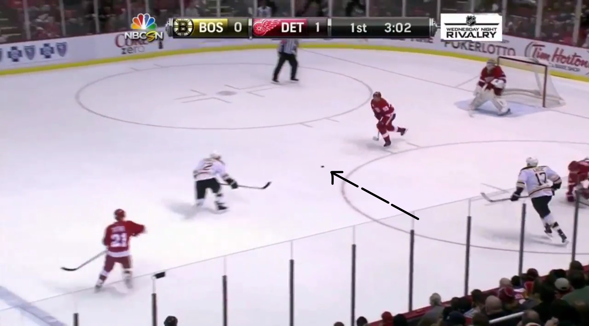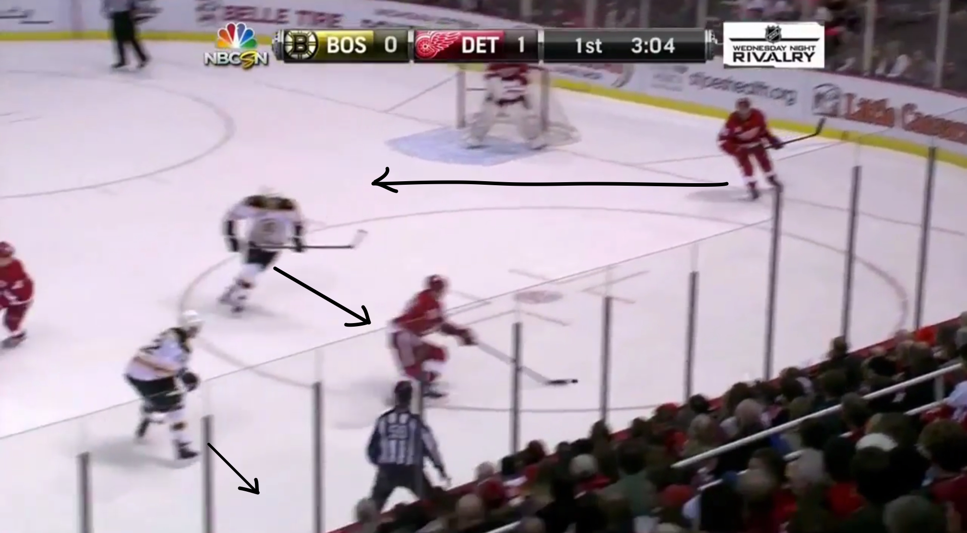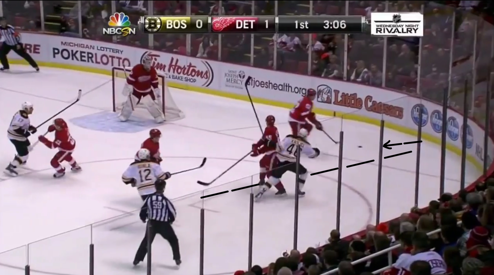 First, Detroit wins the faceoff back to their corner, where two Bruins sit close to the near wall.