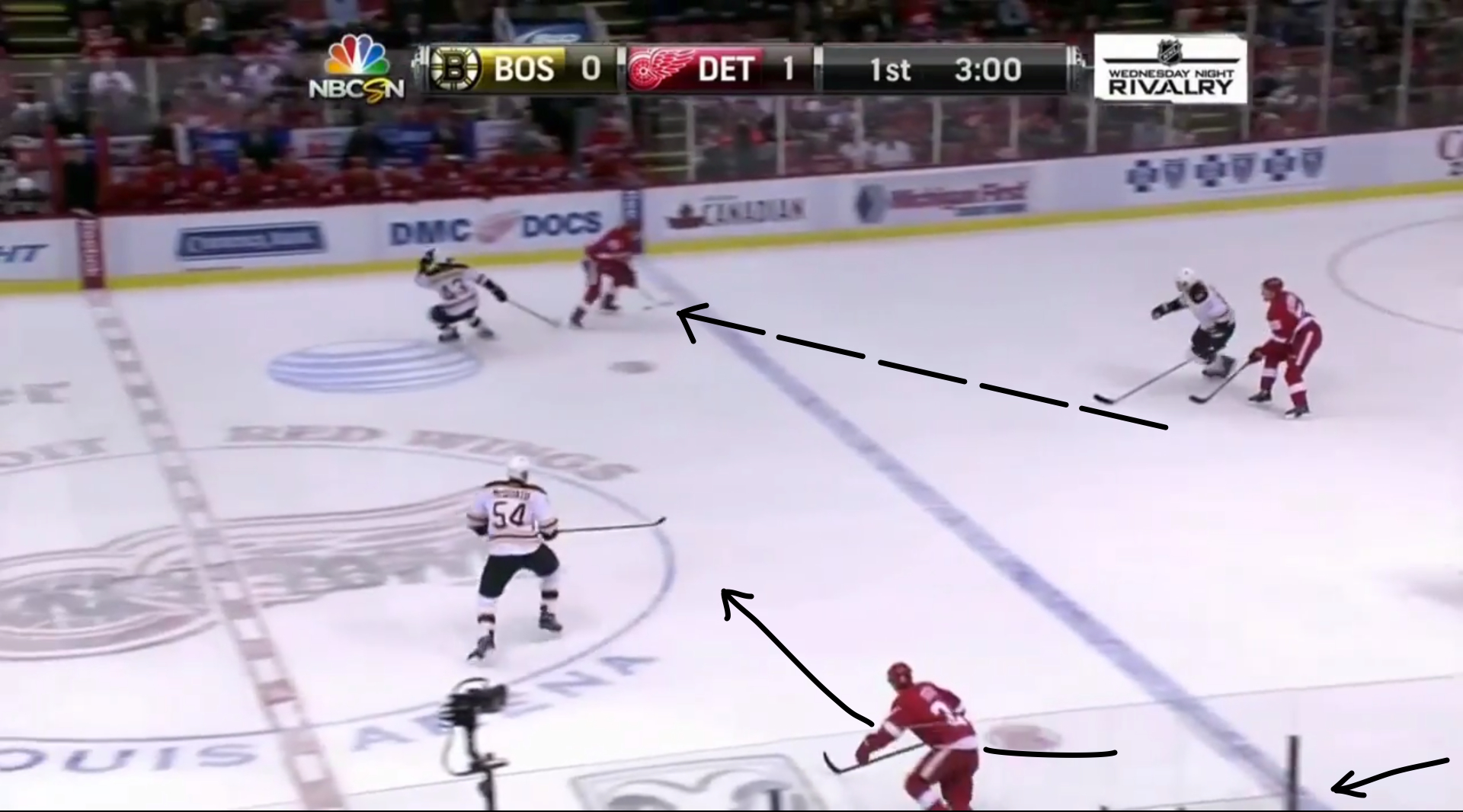 It’s a bit of a clumsy play, but the puck gets to the middle, which allows Detroit’s defender to take a stride, and move the puck to the other side, relieving the pressure from Boston’s overload.