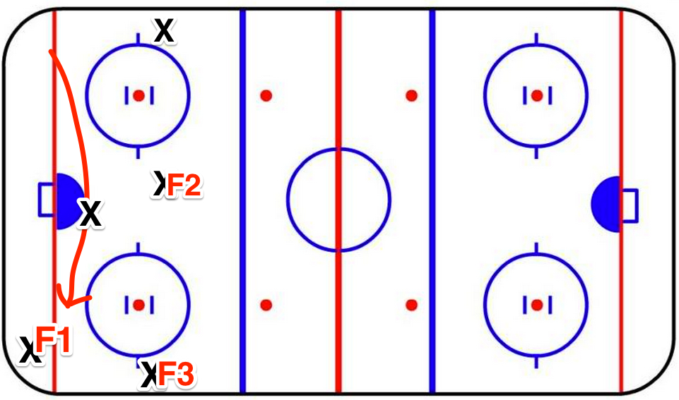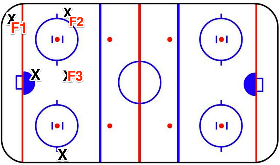 Here’s a look at your generic forecheck. F3 is generally going to be high in the middle above the slot.