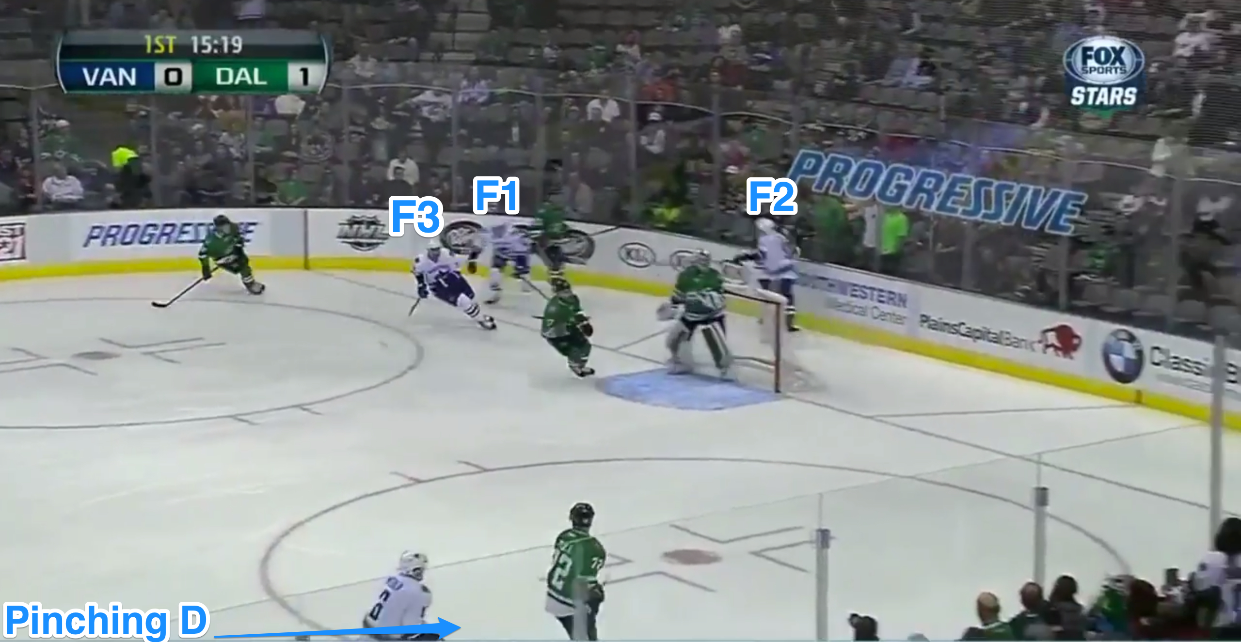 Below is an example of the proper way F3 (number 32, Dale Weise) is supposed to rotate back to cover for the aggressive, pinching D-man.