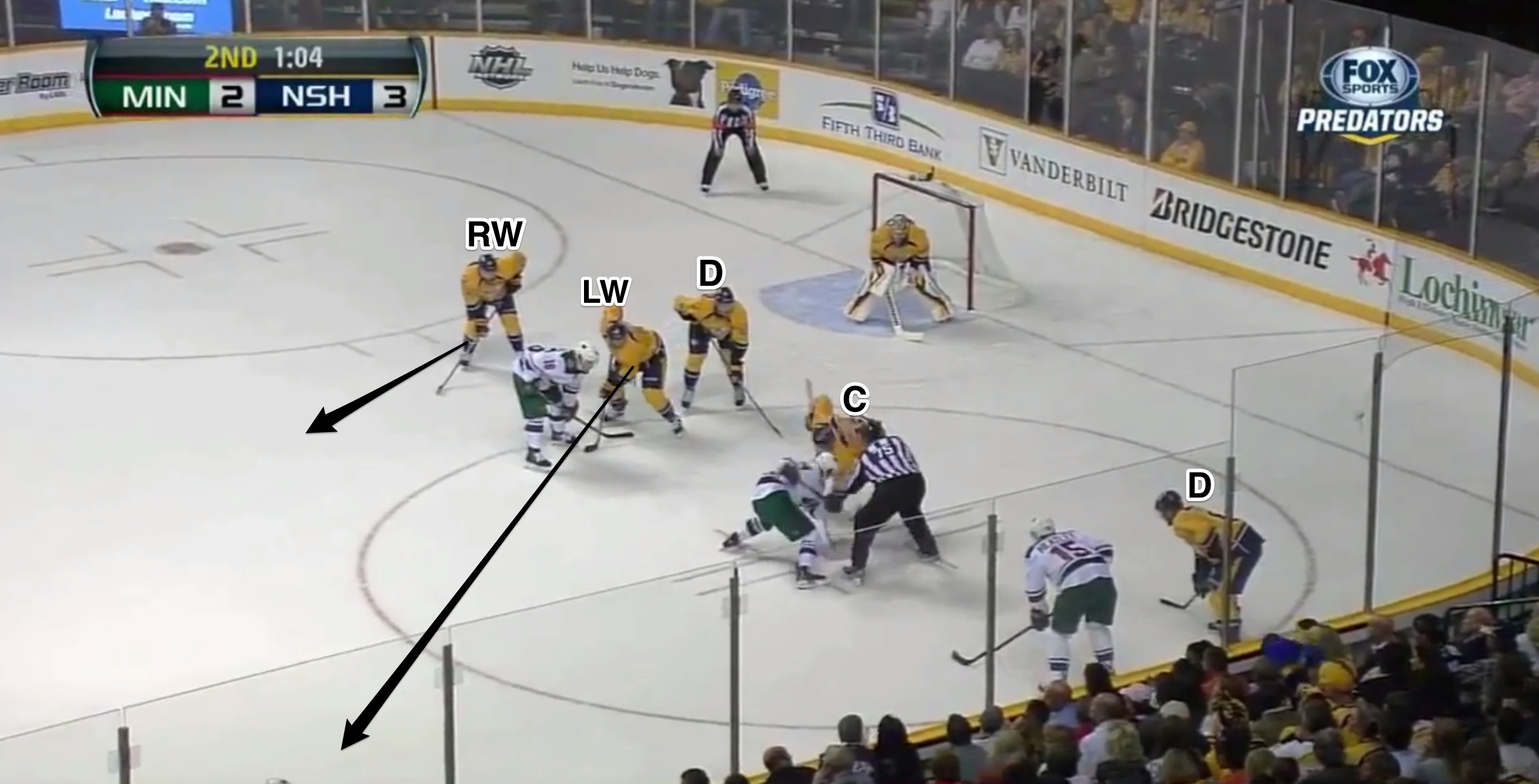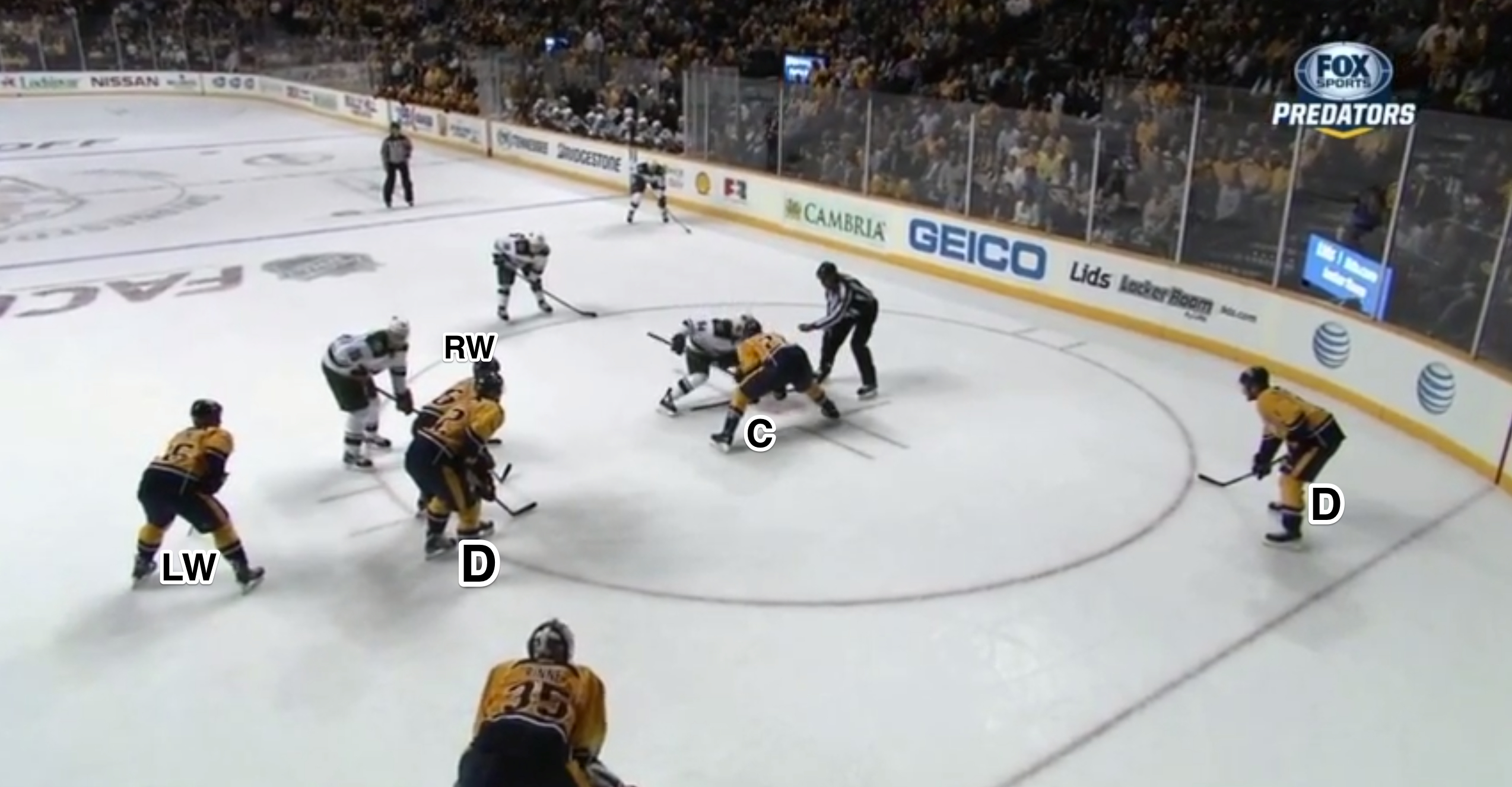 Nashville does nothing special in their faceoff alignment. They line up the strong side winger on the inside and run him out at the boards-side defenseman, and the weak side winger drifts out to the D-man in the middle. The D-men are in the standard spots, reading based on a won or lost draw.