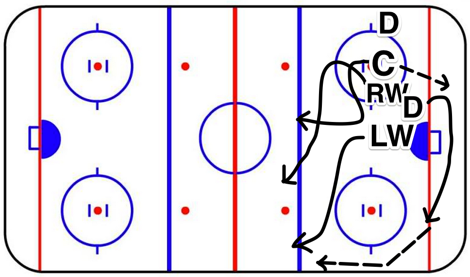 The LW in the picture above will look to see if he can help win the draw on the way out to his D-man (the opposing winger will likely try to pick him a bit on his way to “help win the faceoff” for his team).