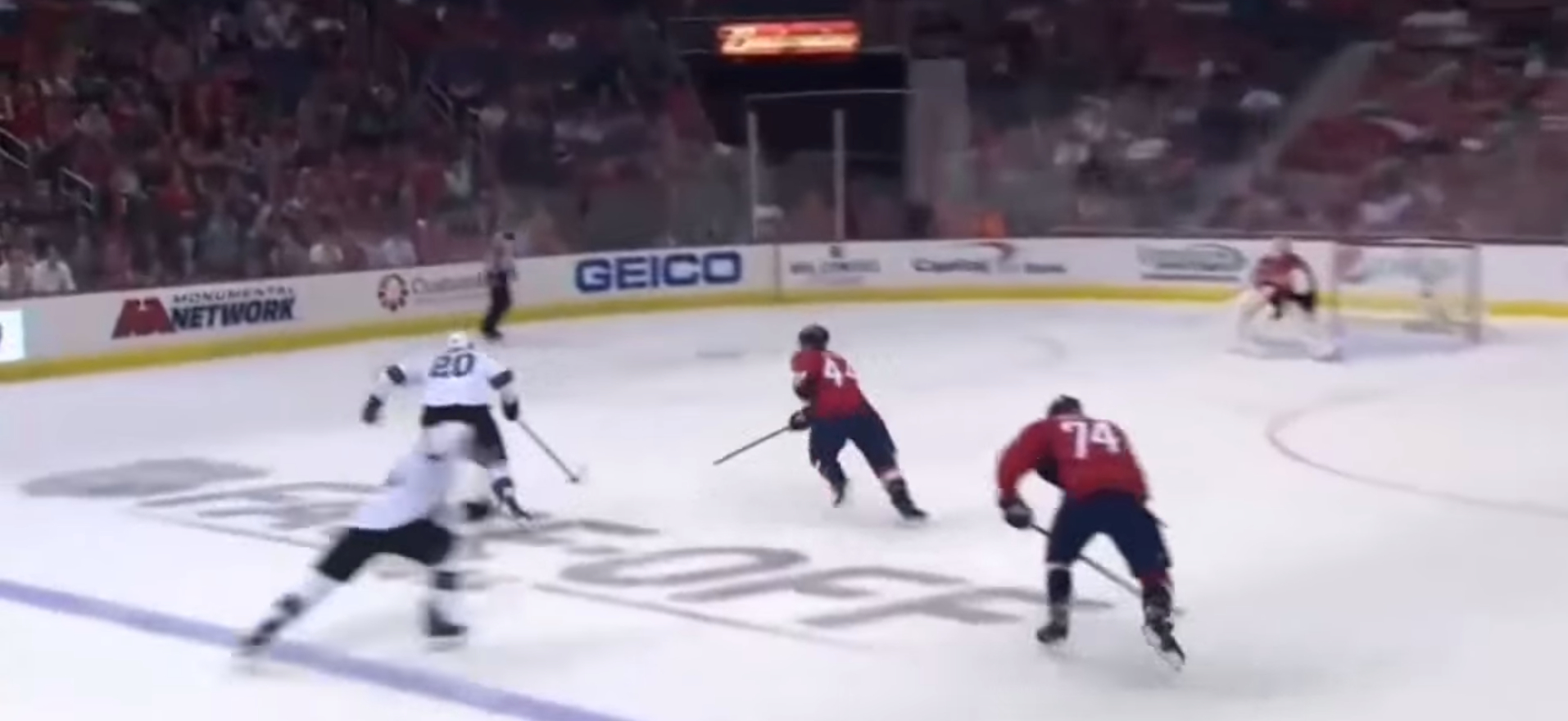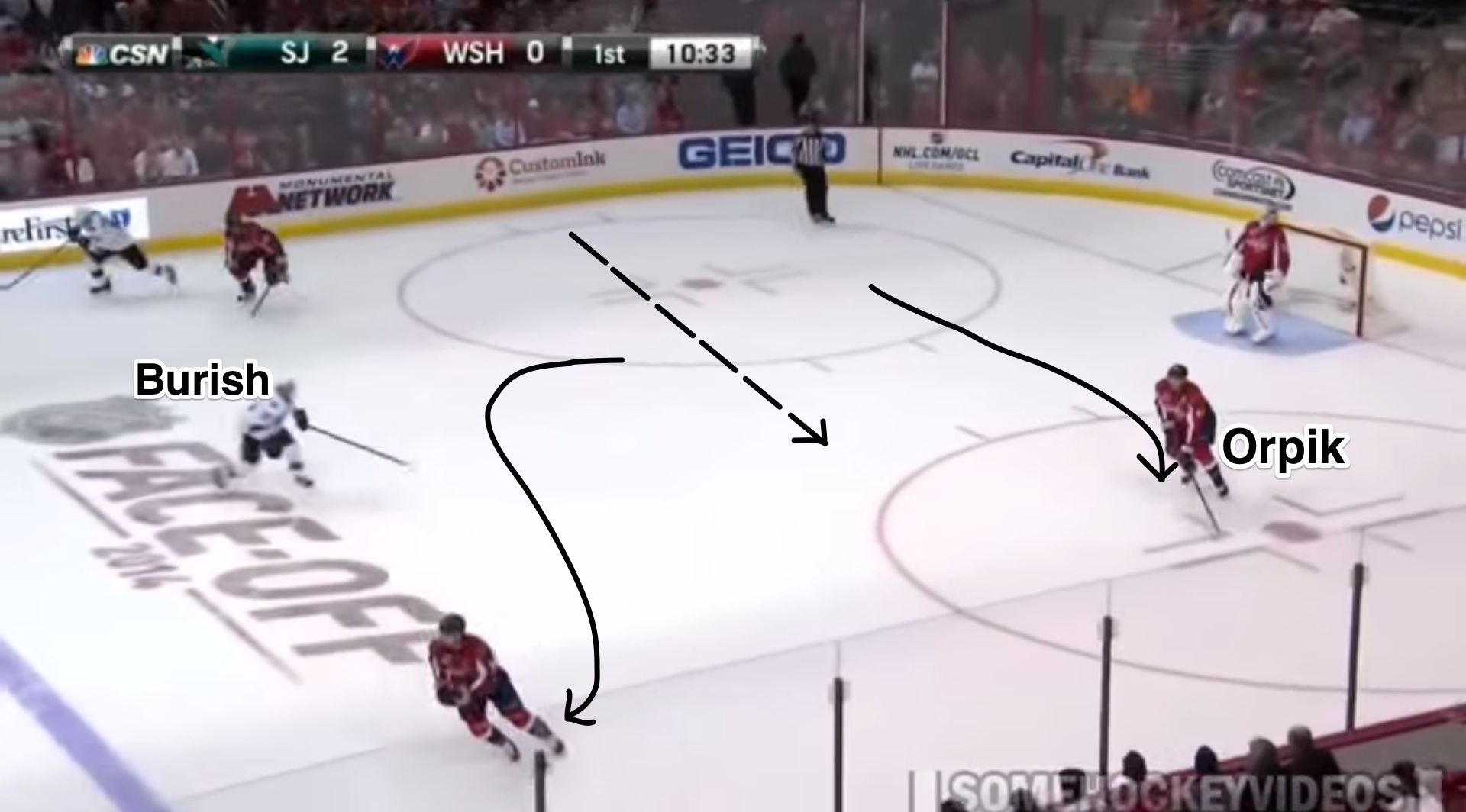 The puck starts from the bench-side boards, with Joel Ward passing the puck through a forechecker to Brooks Orpik in front of the Caps net. It’s a bit of a broken play, as his partner John Carlson is nowhere to be found. But that shouldn’t be an issue.