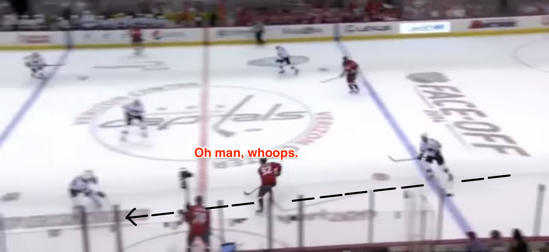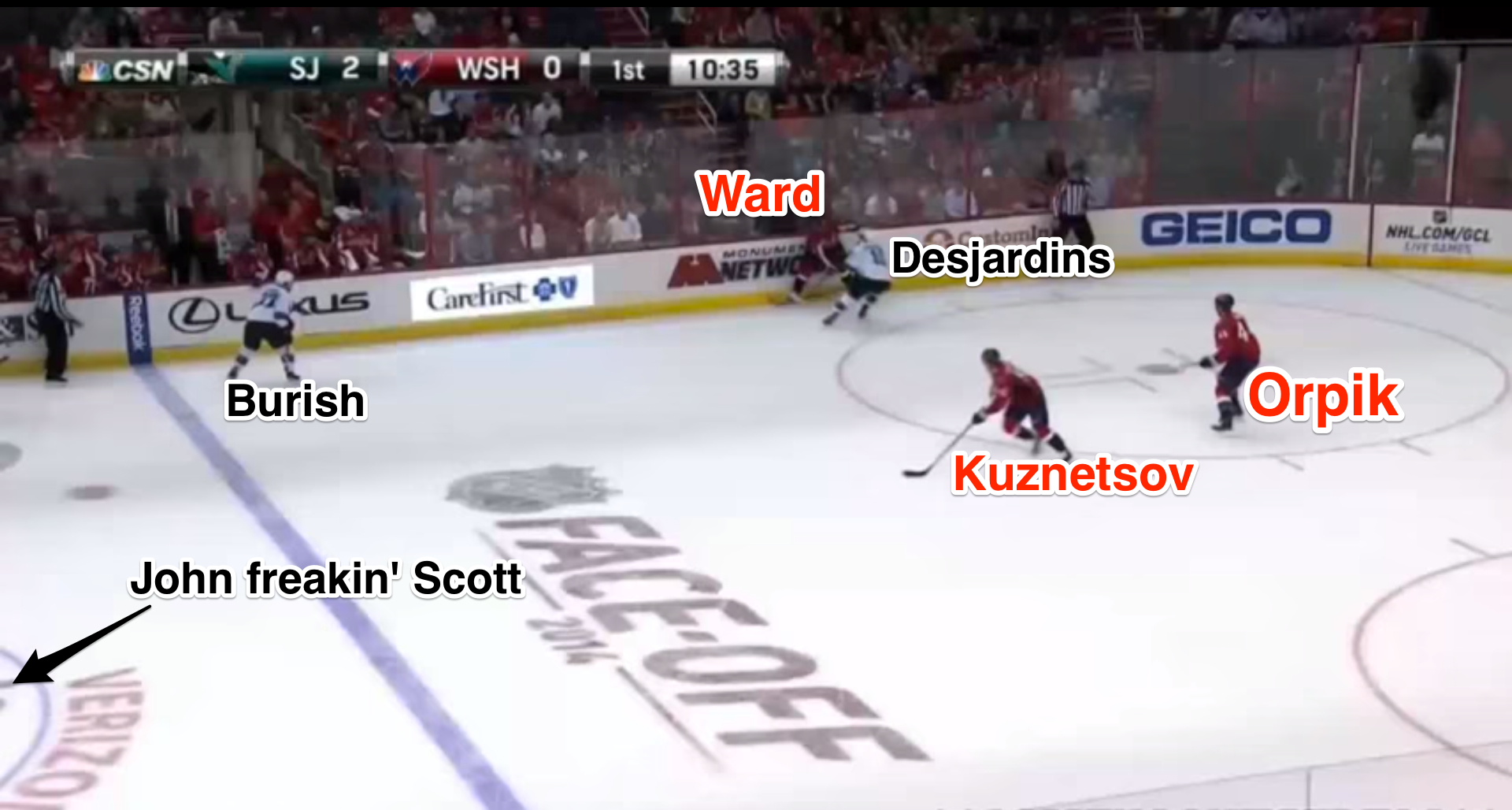 Or more accurately, tries to receive it. Instead it's an “Oh man, whoops” from Kuznetsov. I don’t know if the puck bounces or not, but either way, it goes on through to Sharks defenseman Brent Burns, who wastes 0.0 seconds getting the puck up to Burish. Seriously, he one-times it.
