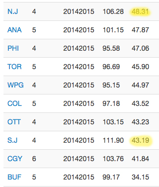 Both the Devils and Sharks rank among the 10 worst teams in even-strength Corsi For percentage, albeit with a very small sample size.
