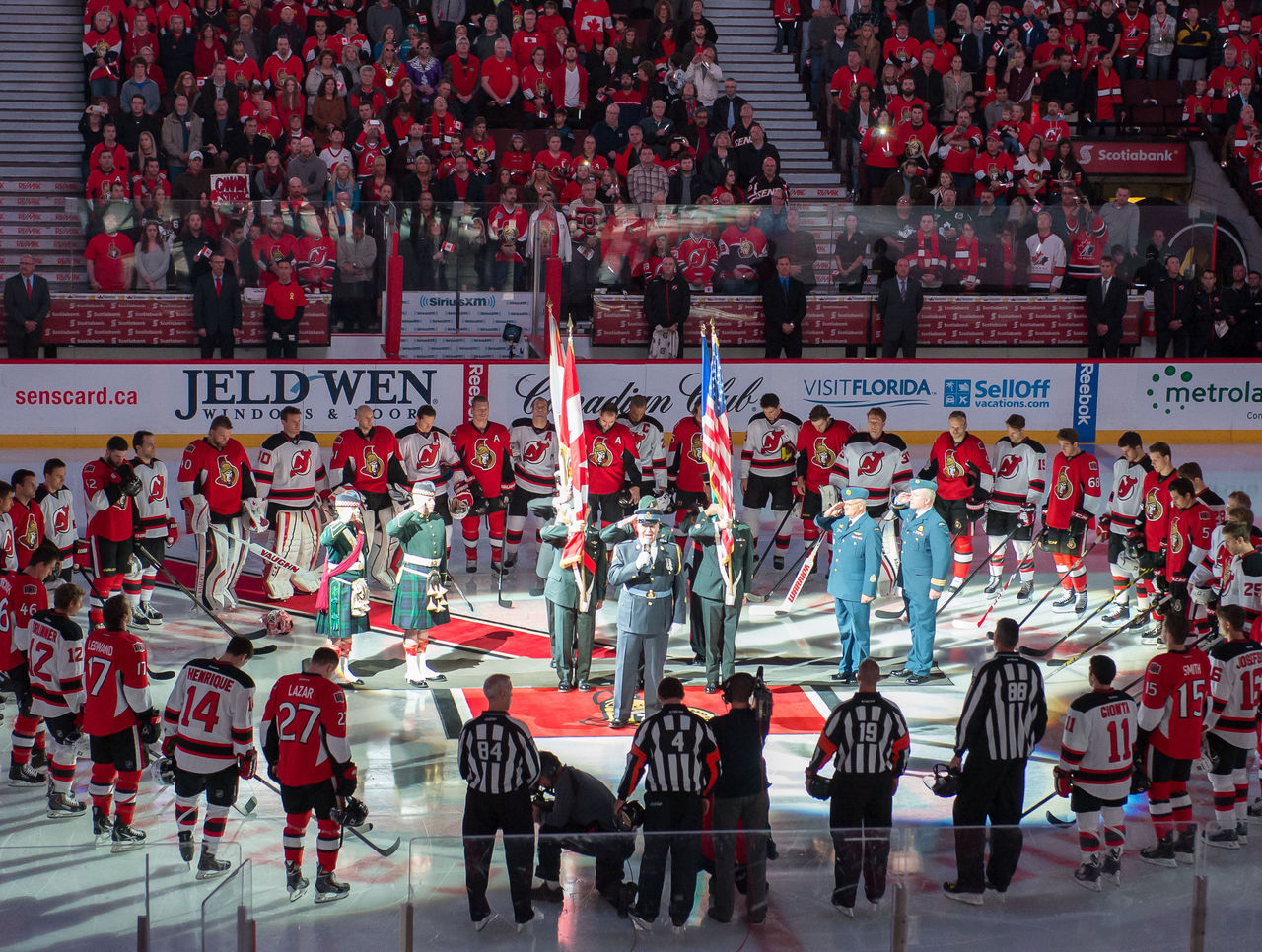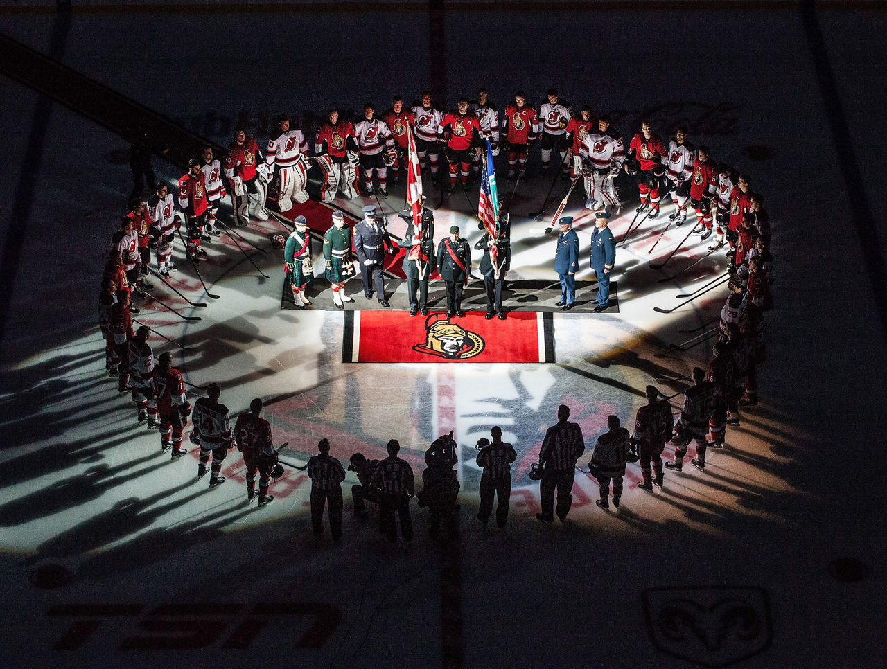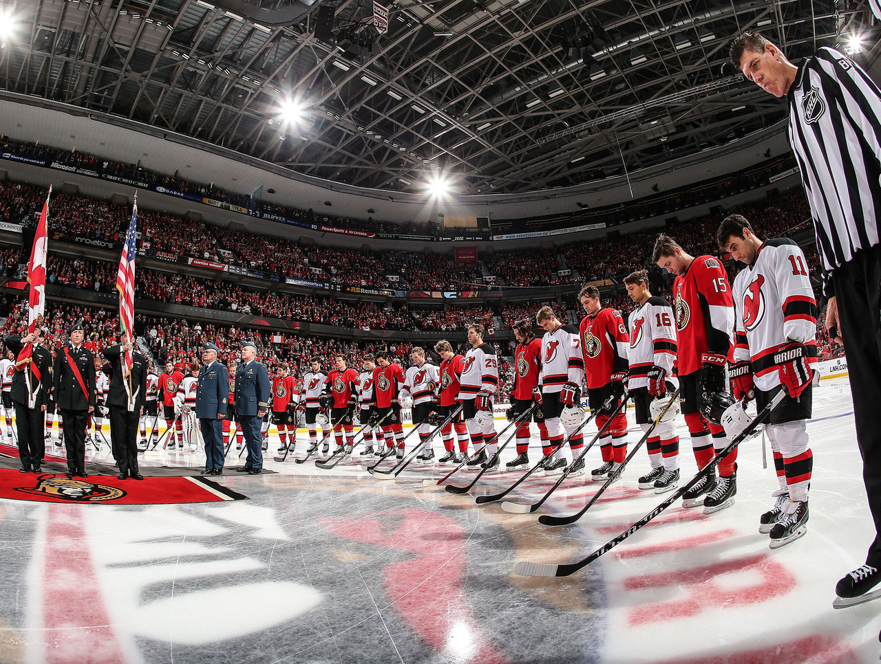 The Senators and New Jersey Devils gathered at center ice and observed a moment of silence for the soldiers killed in Quebec and Ottawa this week.