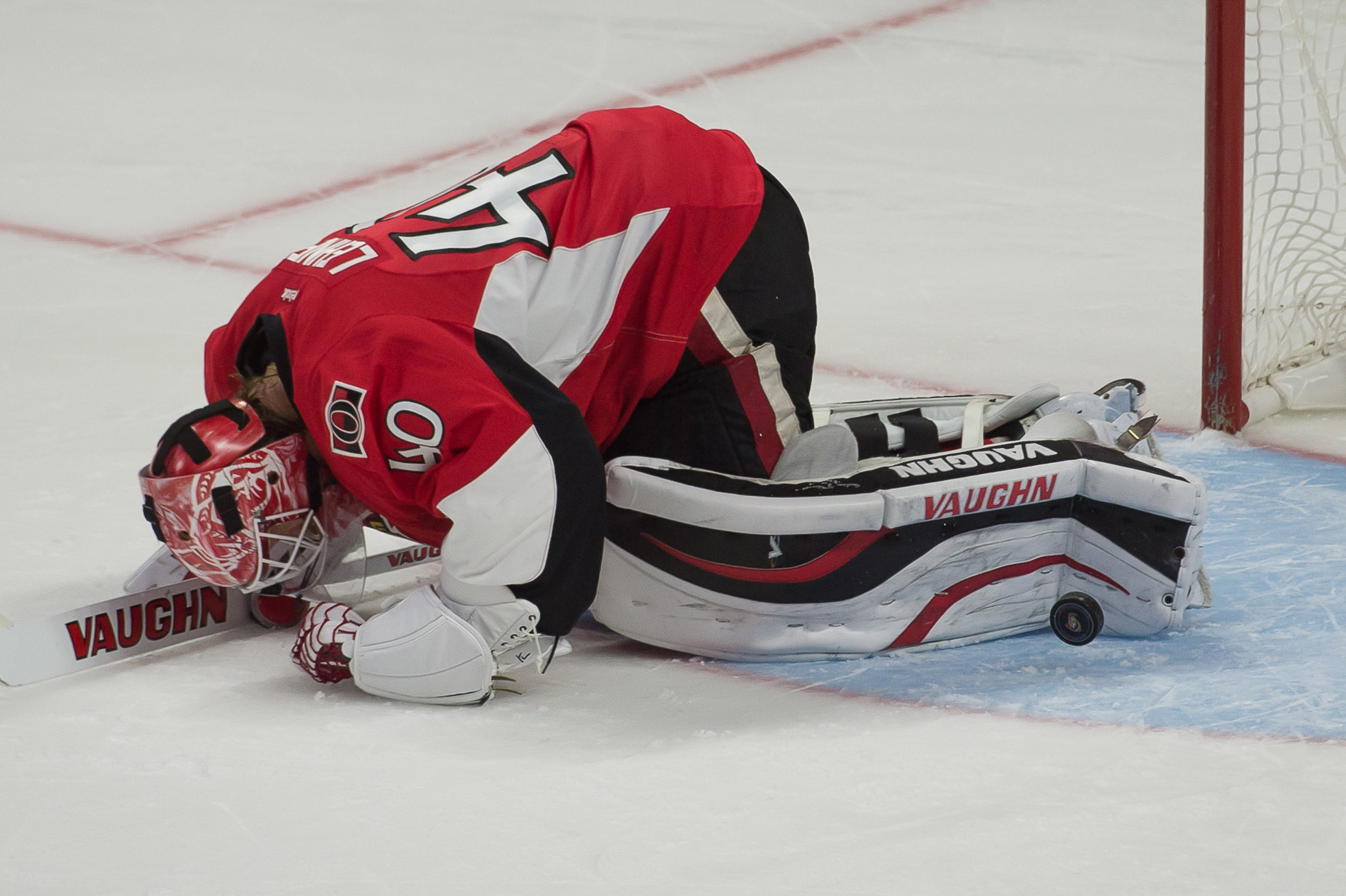 Senators goaltender Robin Lehner fell to the ice in dismay after allowing one of three goals in a 3-2 loss to the New Jersey Devils.