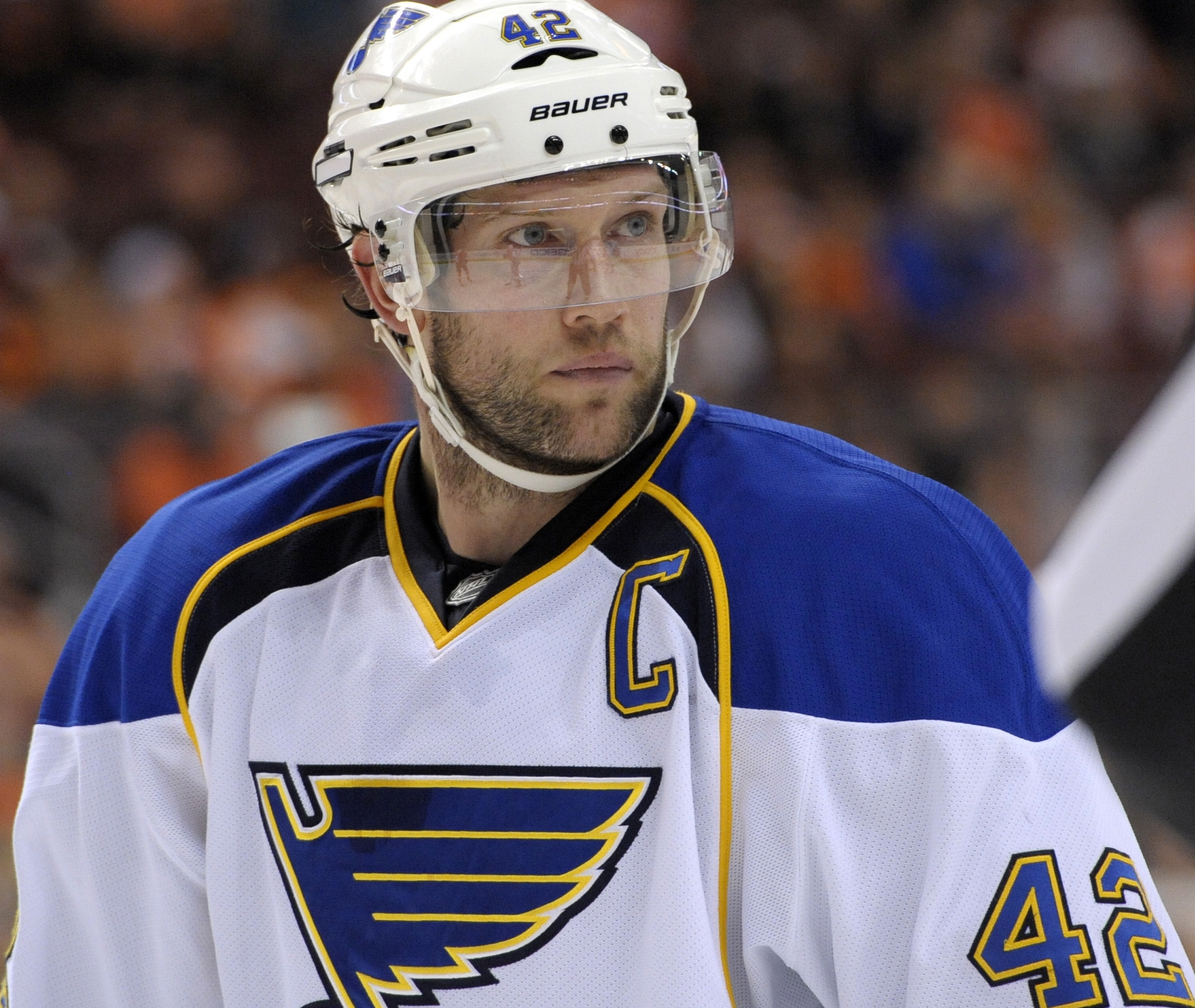 Easy, David Backes. The lettering on your sweater still suggests this is your team, but that's about it.