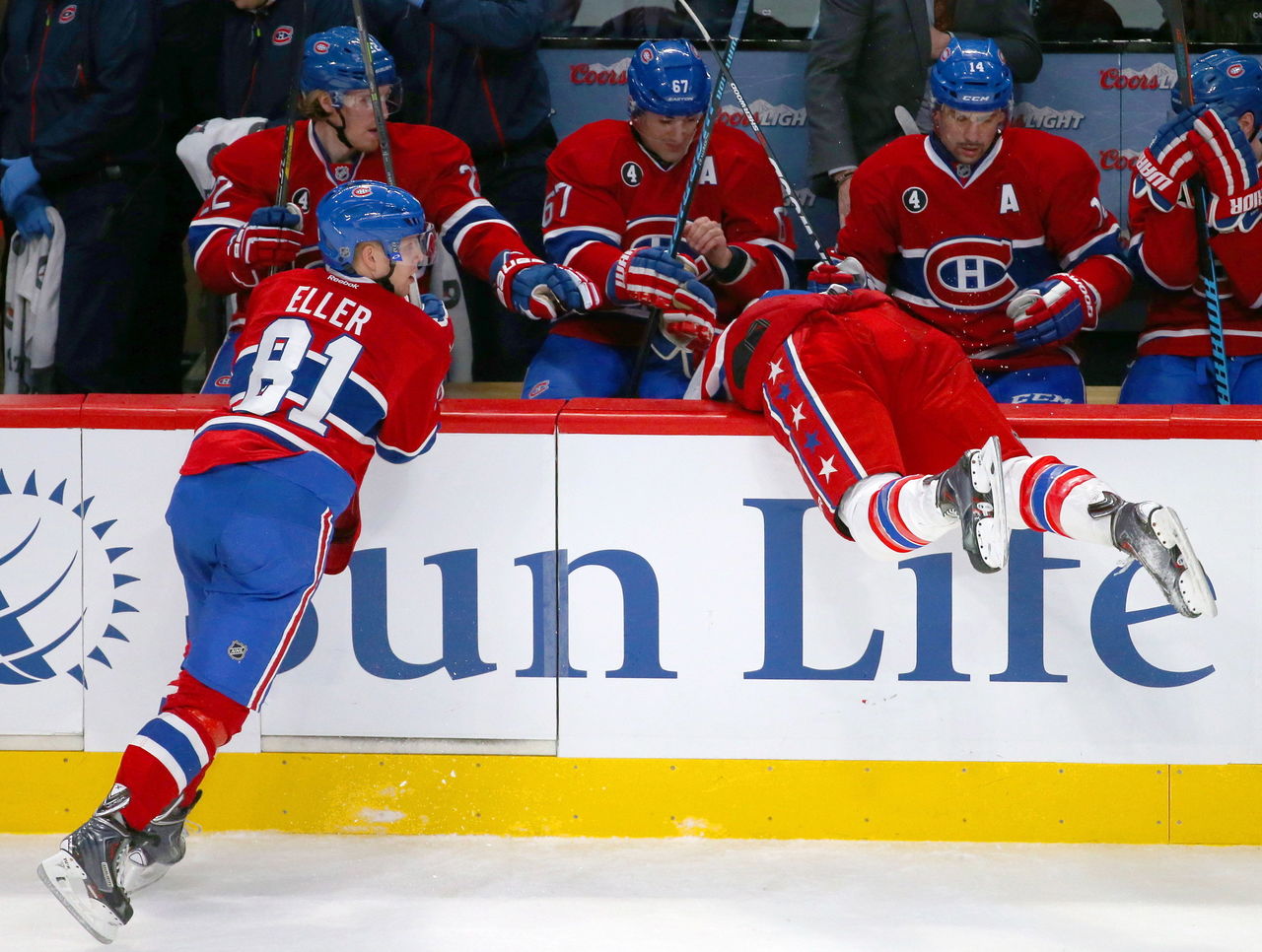 Montreal Canadiens forward Lars Eller dumps Washington Capitals winger Tom Wilson into the Canadiens bench in the third period of Montreal's 1-0 victory at the Bell Centre.