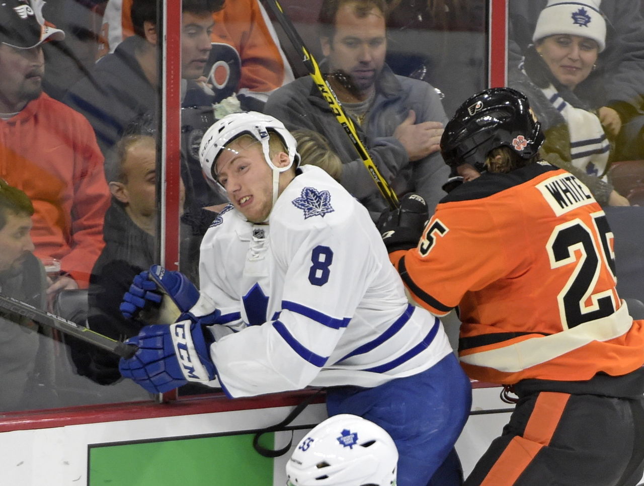 Toronto Maple Leafs rookie defenseman Petter Granberg nearly loses his helmet as he absorbs a thunderous hit from Philadelphia Flyers center Ryan White during an historic 1-0 loss by the Maple Leafs.