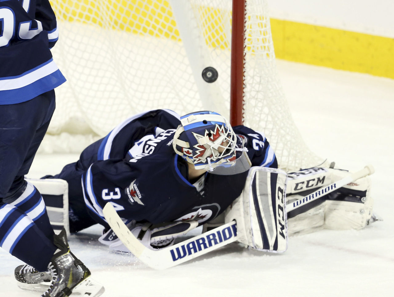 Winnipeg Jets goaltender Michael Hutchinson looks to his left in search of the puck after Dallas Stars forward Jason Spezza puts it over him in the second period of a 5-2 Stars' win.