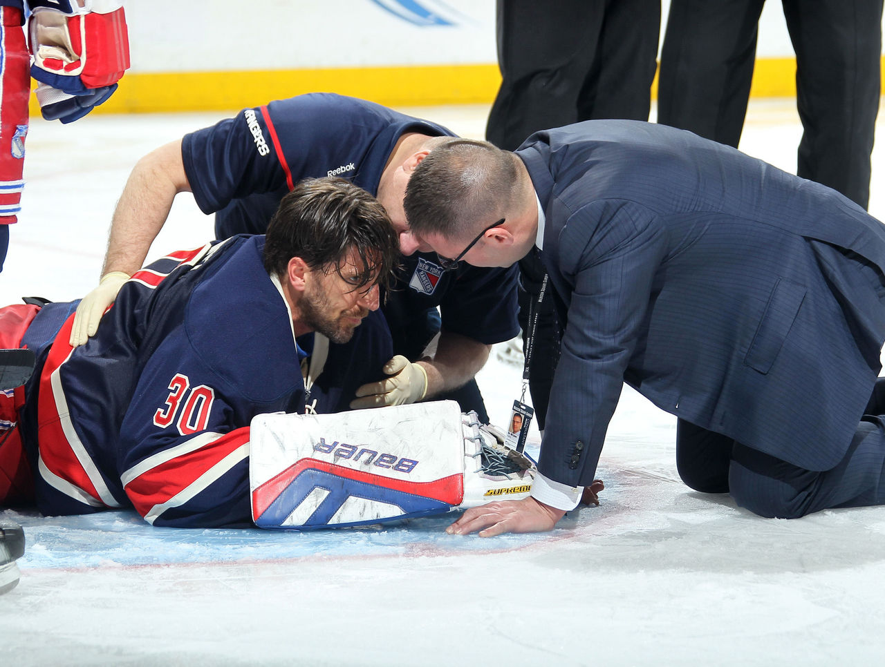 The New York Rangers medical staff attends to goaltender Henrik Lundqvist after the netminder takes a puck to the throat during a 4-1 win over the Carolina Hurricanes.