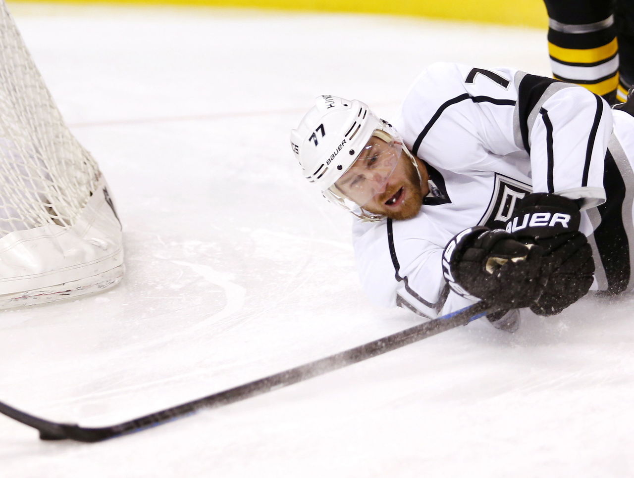 Los Angeles Kings forward Jeff Carter attempts to control the puck while lying on the ice in the first period of a 3-1 loss to the Boston Bruins.