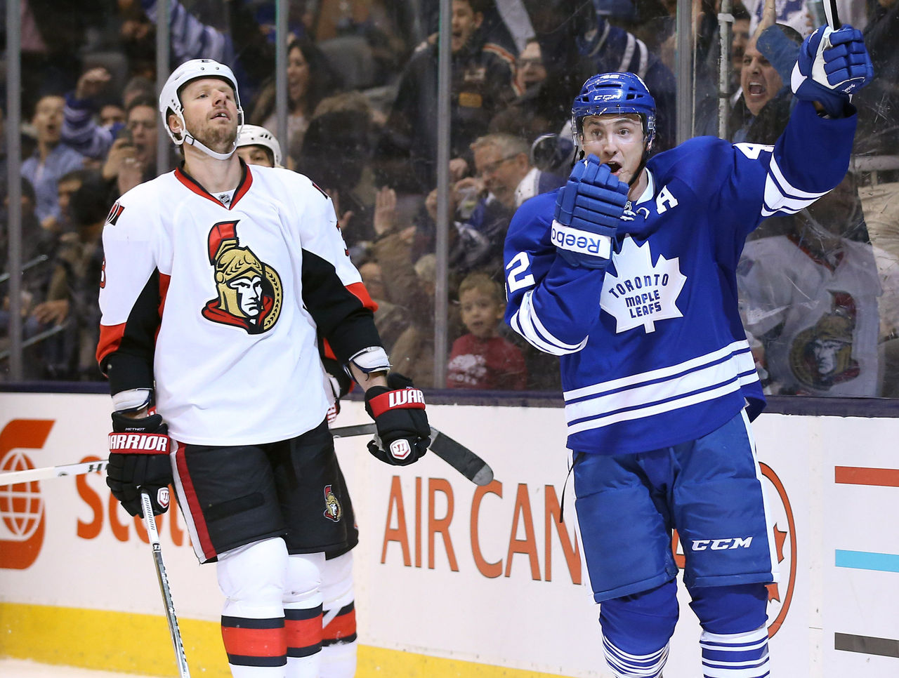 Toronto Maple Leafs forward Tyler Bozak looks pleasantly surprised and Ottawa Senators defenseman Marc Methot appears distraught after Bozak scores his third goal in Toronto's 4-3 win.