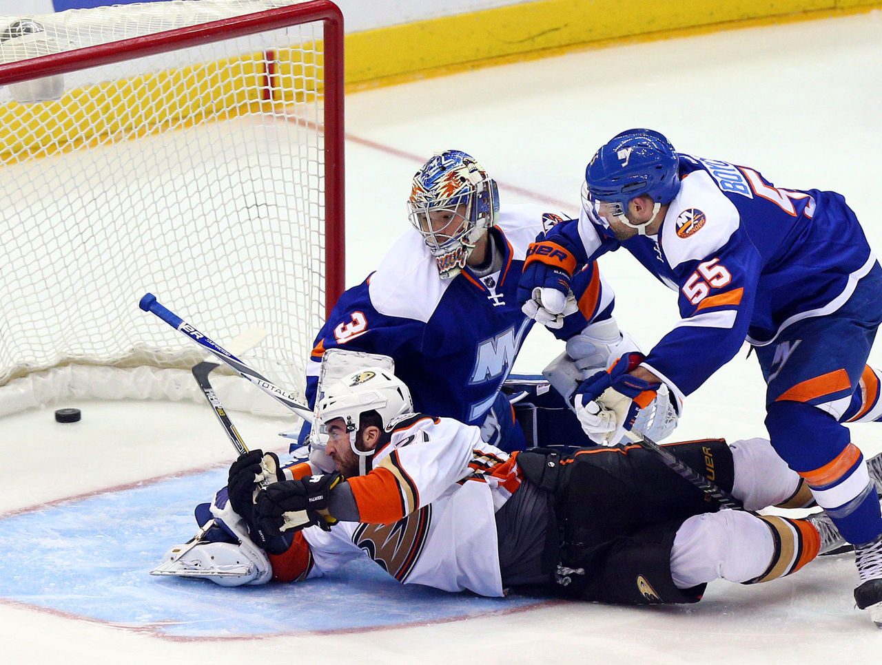 Anaheim Ducks forward Kyle Palmieri scores while lying on the ice in a 3-2 win over the New York Islanders.