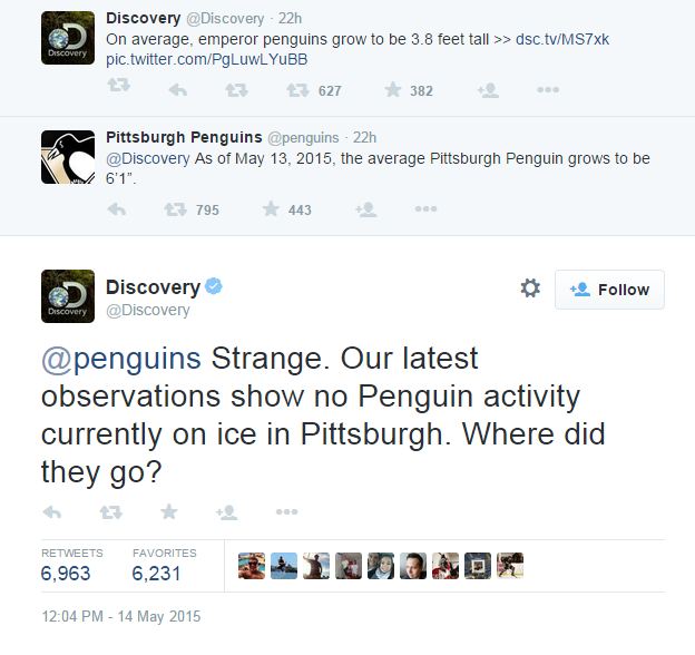 On Wednesday night, the Penguins playfully responded to a tweet by Discovery Communications, which owns television networks like TLC, Animal Planet and the Discovery Channel.