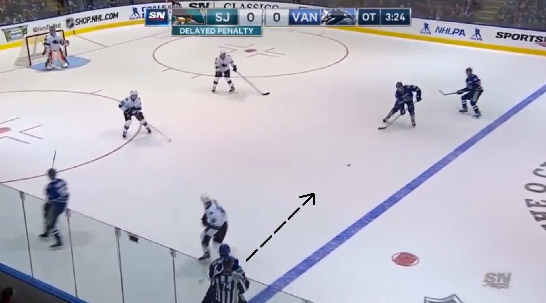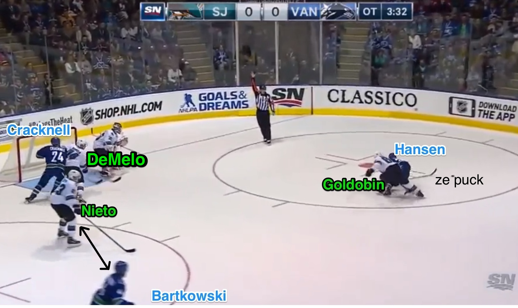 Nikolay Goldobin takes down Jannik Hansen, and is getting a penalty. He shouldn't have done that. Penalties, it turns out, are bad. From there, Hansen has the wherewithal to get up and stay on the puck, and he circles it back up top. Get ready for lots of this in overtime - guys ragging the puck looking for holes while their linemates offer support, and look for soft, dangerous areas of ice to exploit.
