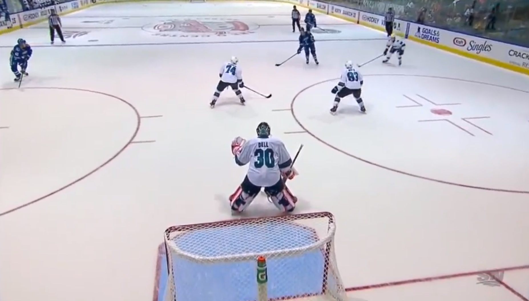 Quick sidebar: This was a common misconception of those arguing against 3-on-3 in the first place - that teams would just sag to the low-middle and it'd be boring. As you can see above, even if the fourth Canuck doesn't jump on the ice, the gap Cracknell is left with would still be a full-on panic party. Sagging creates major issues when you're three-up.
