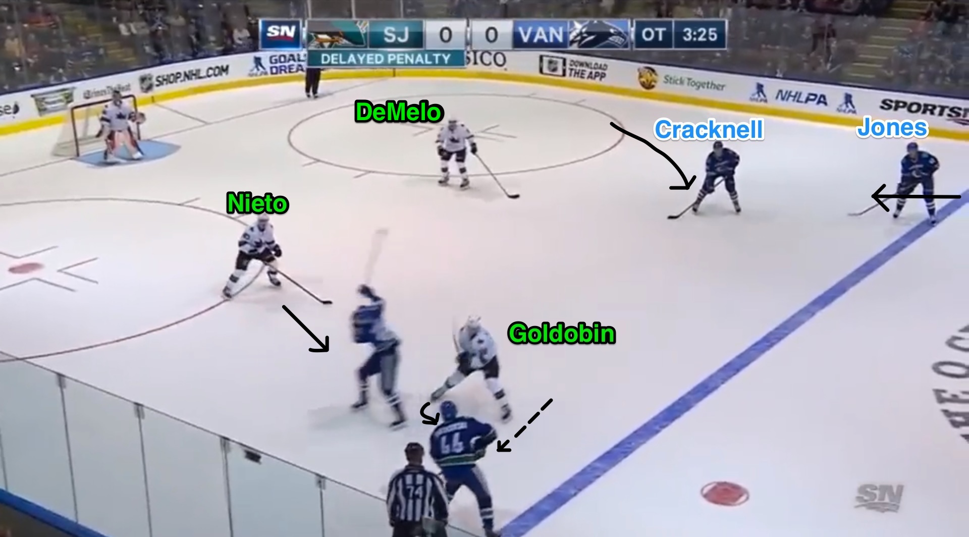 Well, in Nieto’s simple forward mind (I mean forwards are simple, not Nieto), Hansen is his guy off the switch; had the fourth forward not jumped on the ice, that would probably be just fine. But he has, and with DeMelo leaving the slot area so untouched, Nieto needs to hit the big red panic button like a hanging curveball, and hit it hard.