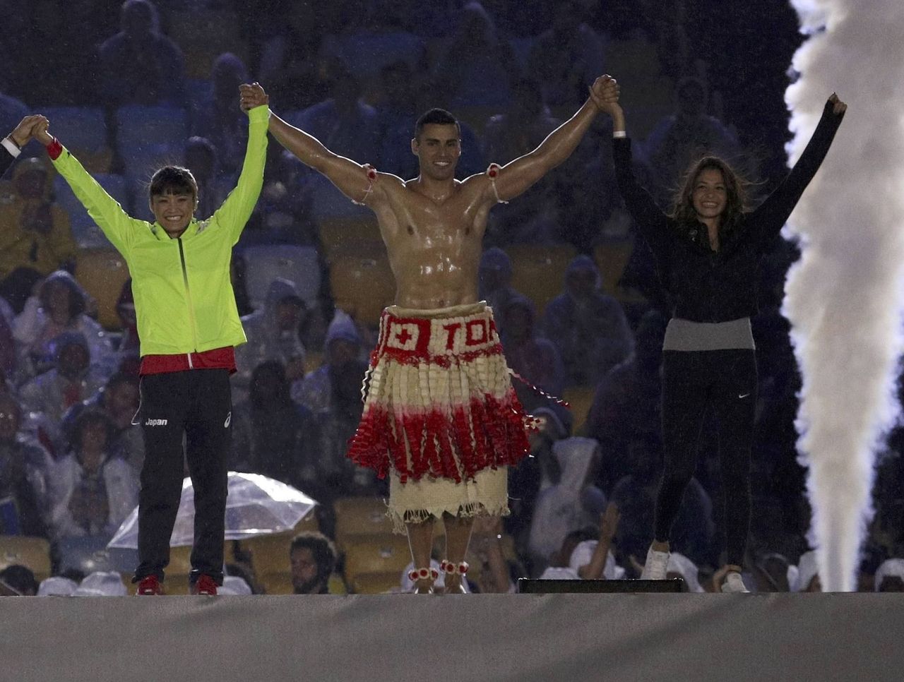 After emerging as the breakout star of the opening ceremonies, the Tongan flag bearer made a triumphant return to say goodbye to Rio during Sunday's closing ceremonies.