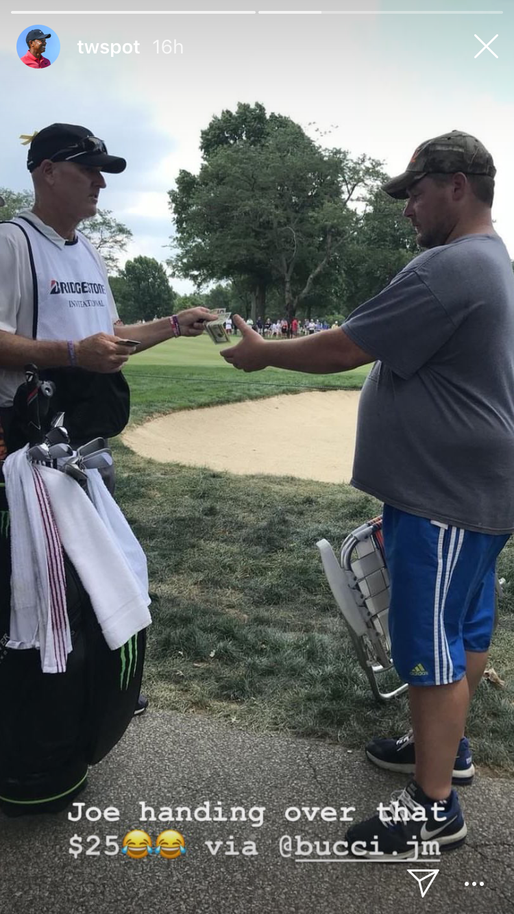 An eyewitness confirmed the story in the comments of an Instagram post by Tiger Woods Spot, and shared a photo of LaCava handing over the $25 to the heckler.