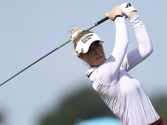Korda opened with seven consecutive pars, including at the 317-yard, par-4 seventh hole, where she hit a 294-yard drive into a valley just short of the green. Her initial pitch from there ricocheted off the edge of the green and rolled back down the slope to where she was. Korda hit her next shot to 2 feet and saved par.