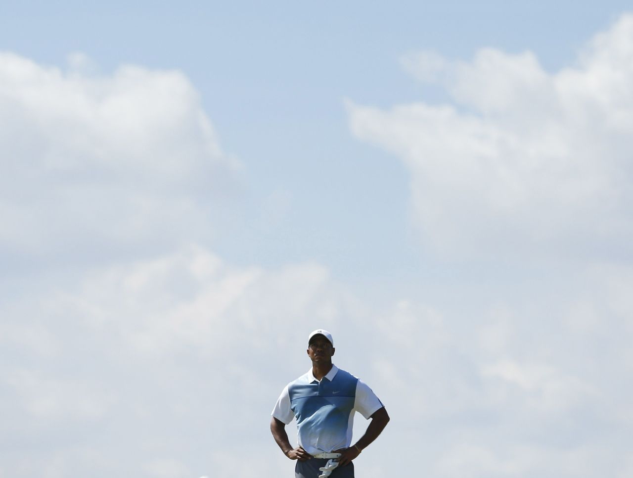 Tiger Woods stands in front of a blue sky