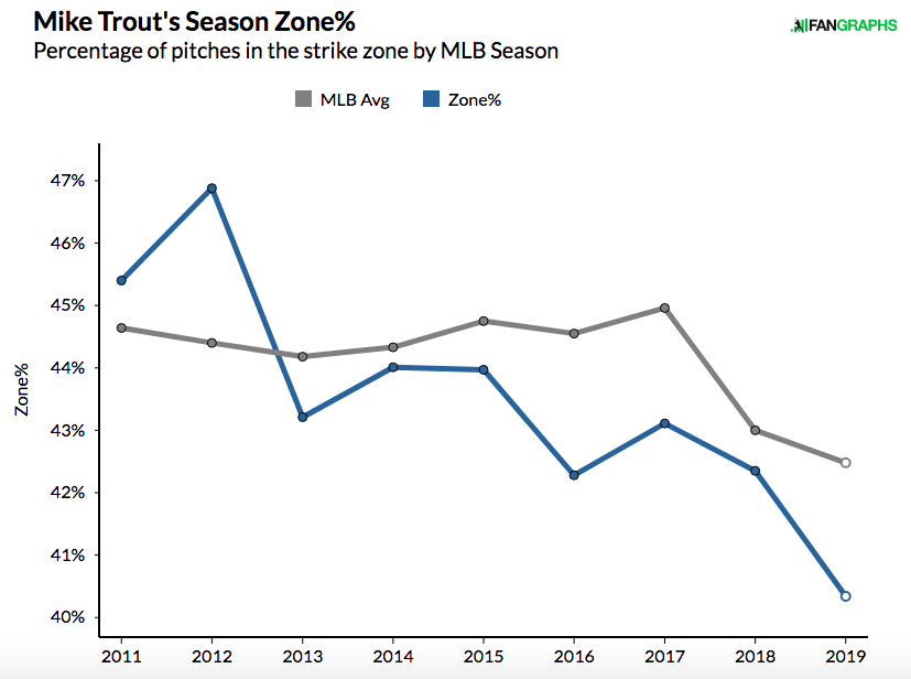 Through the first two months of the 2019 campaign, Trout has seen the smallest percentage of pitches inside the strike zone (40.4 percent) of his career. And while MLB hurlers have been more disinclined, in general, to throw pitches inside the zone this year, Trout's drop-off is disproportionate, having fallen 2 percentage points from 2018. The paucity of strikes he's seeing right now is downright Bondsian. In fact, Trout's current zone rate is lower than Bonds' was in 2004.