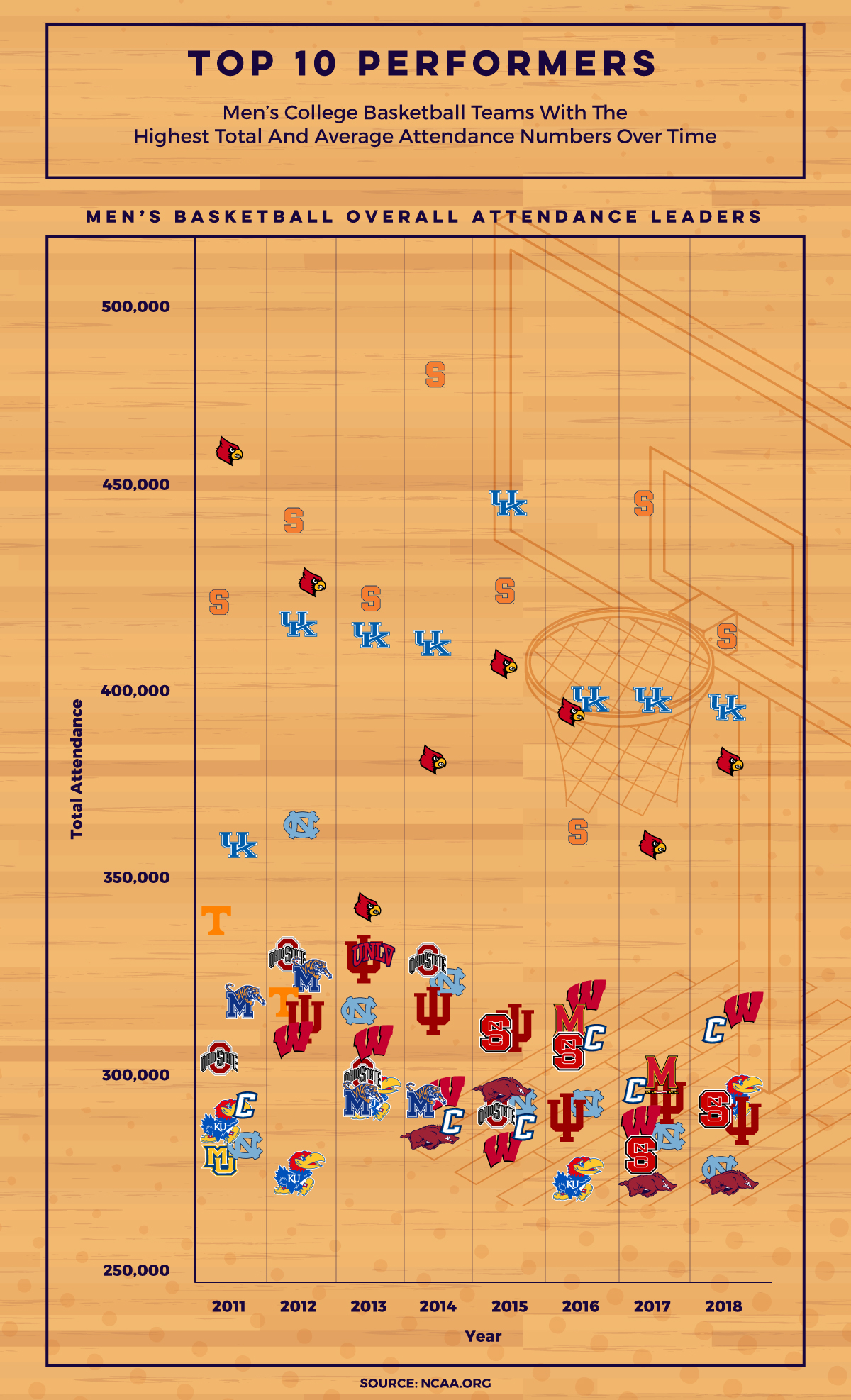 Analyzing NCAA attendance records for every D-I team and conference from 2011-18, Grand Canyon found that the Orange had the highest total attendance for five of those eight years. Kentucky had the highest per-game attendance among men's teams, while Tennessee took the top spot on the women's side.