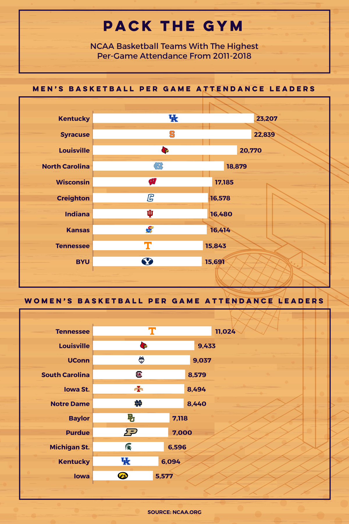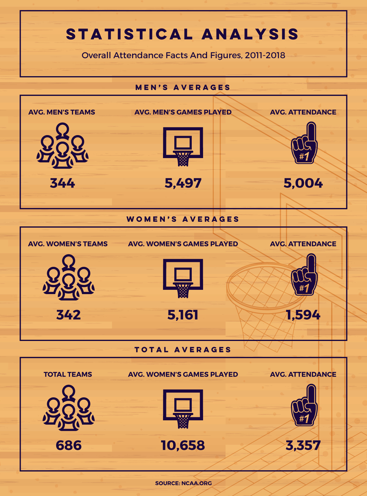 The average attendance for a men's basketball game from 2011-18 was 5,004, compared to 1,594 for women's games.