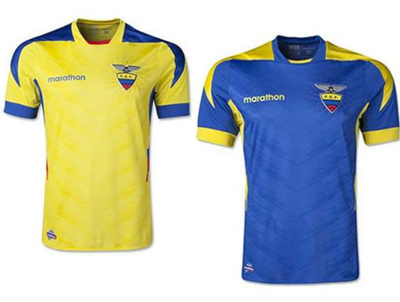 Ecuador makes their return to the tournament after missing out in 2010 and once again will be the only participating nation who's kits are designed/sponsored by Marathon - a local Ecuadorian athletic supplier. The home kits feature every color in Ecuador's national flag - they are predominantly yellow with the Marathon logo in one corner and the Ecuador national team badge on the other. Shoulders feature a blue pattern, sleeve cuffs are also blue, there's a small strip of red at the bottom of the front collar. A sublimated starburst pattern behind the badge.