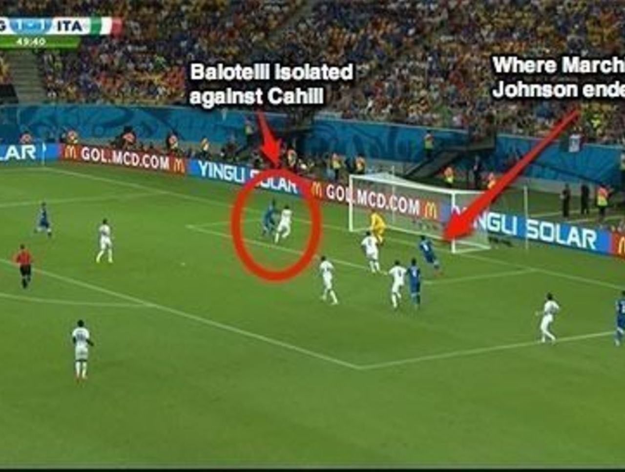 That leaves Cahill in a one-on-one situation with Balotelli, and when Candreva whips in a perfect cross to the back post, Cahill, caught ball watching just slightly, has no support in behind from Johnson.