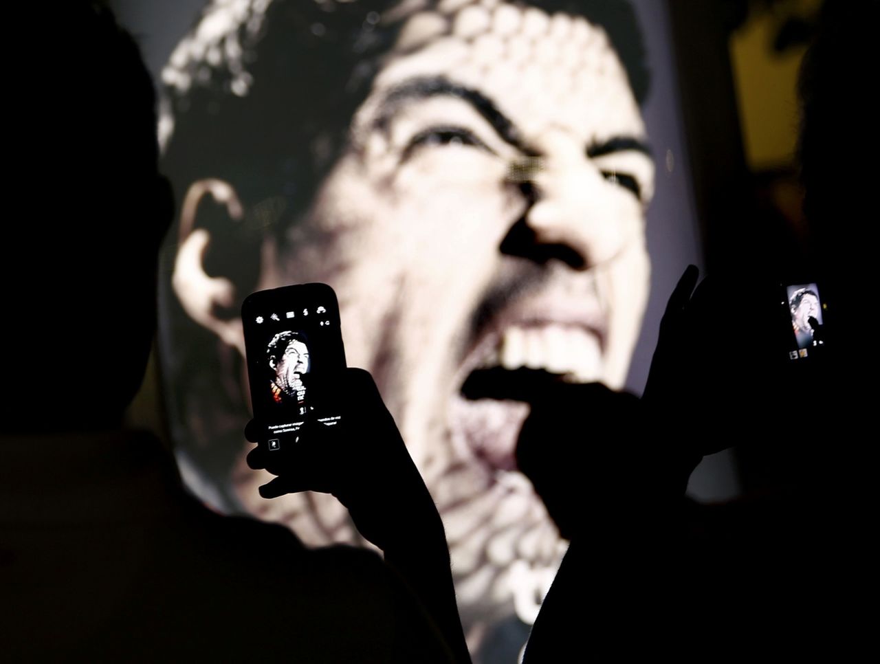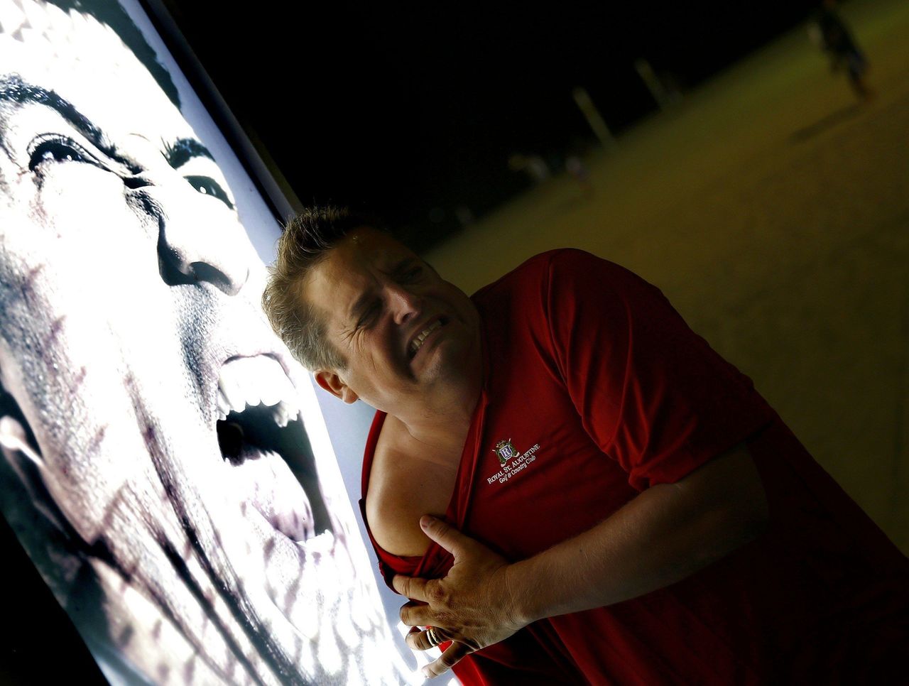 Fans are lining up to take their pictures with the poster, framing their photos so as to make it appear that the famous biter is chomping on them.